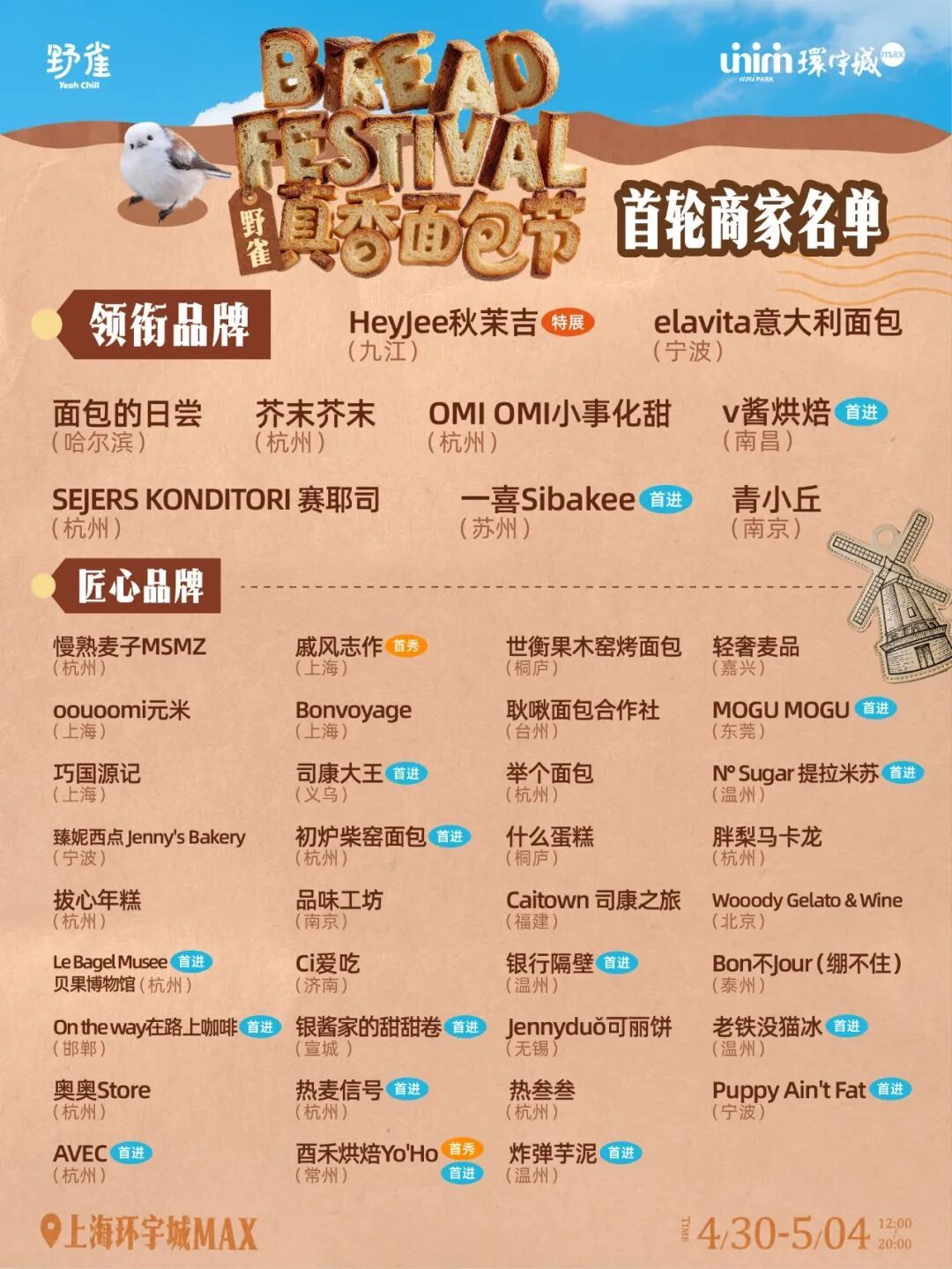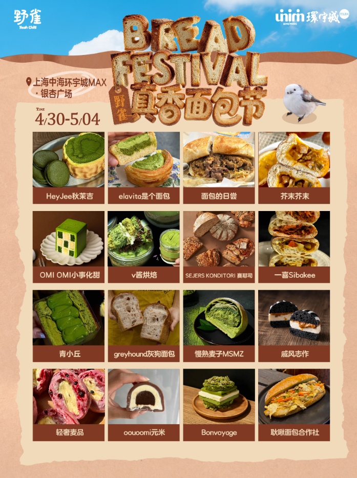 中海真如环宇城MAX携手野雀市集共同举办的野雀·真香面包节(后称真香面包节)正式定档,活动将于2026年4月30日至5月4日(每天12:00-20:00)举行。本次活动在规模、品牌阵容、游玩体验等方面全面升级,为市民“五一”假期提供新玩法和好去处。 据悉,本次真香面包节规模创新高,现场共集结60余家优质商户,涵盖面包烘焙、咖啡茶酒、文创周边等多元品类,实现逛吃玩购一站式服务。其中,40余家外地特色品牌同步入驻,包含22家首次进入上海市场的品牌,市民无需远行,即可体验全国各类特色风味。 真香面包节 真香面包节限定产品“抹茶八重奏”,以多层抹茶风味为主调,口感绵密回甘,精准契合抹茶爱好者需求;同时现场汇聚齐齐哈尔烤肉酸菜恰巴塔、乌饭麻糍豆乳卷、龙井柚子可露丽、冻啃生巧团子等地方特色产品,满足消费者多样化的味蕾需求。 真香面包节参与品牌(以现场为准) 除产品展示外,活动设置多个专属打卡点位,通过场景化布置提升游玩体验感,为市民提供便捷的拍照打卡场景。福利活动方面,市民关注相关小红书账号,即可领取集章地图,完成对应集章任务可兑换冰箱贴、帆布袋等定制周边;现场同步开展摊位口味评比活动,邀请市民参与投票,选出优质商家。 真香面包节参与品牌(以现场为准) 值得一提的是,商场方面将推出6.6元专属早鸟福利,可抢购价值30元的早鸟礼包,内含真香显眼包·巨型购物袋、吐司毛绒零钱包、面包毛绒发箍(款式随机)、MAX面包人徽章(款式随机),及商场内指定烘焙品牌5元优惠券,限量开抢,先到先得。 历届真香面包节(资料图) 今年是中海真如环宇城MAX原创IP真香面包节连续举办的第三届。据了解,此前两届活动已积累超高人气,累计吸引超10万名消费者到场参与。品牌阵容逐年扩容:首届汇聚30家特色品牌,2025年升级至46家,精选衡复区网红品牌及外地特色主理人品牌,构建“一站式烘焙地图”。此外,4月25日-26日17:00-19:00,中海真如环宇城MAX银杏广场还将上演街头艺术表演,为市民带来沉浸式音乐体验。 历届真香面包节(资料图) 据了解,去年面包节积极联动普陀区 “五五购物节”,跨界联动丰富活动场景与内容。户外美学生活市集依托普陀区汽车产业优势,打造沉浸式消费场景,推动汽车文化与生活美学深度融合;全龄友好邻里生活市集集合优质资源,开设中医义诊、非遗市集、劳动者集、青春普陀互动及亲子游戏区等活动,实现消费场景与社区服务的有机结合。 便民信息 交通方式:地铁11、14号线真如站 地址:中海真如环宇城MAX 银杏广场 时间:2026年4月30日-5月4日(每天12:00-20:00)