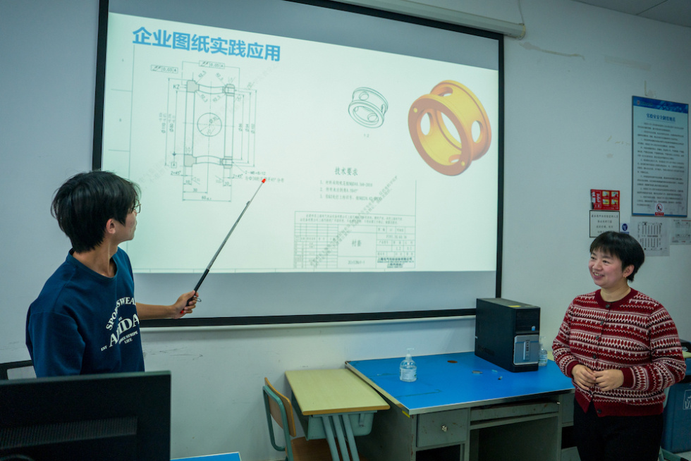 一张来自生产车间的“曲拐精加工图”,成为上海电机学院《机械制图》课程的第一课。图纸上,不仅有几何形状,还有尺寸标注、配合公差、上下极限偏差、全跳动形位公差、表面粗糙度等真实工程信息。在入学第一年就能拿到企业真图纸,张同学很激动:“我感觉自己在做真产品。”