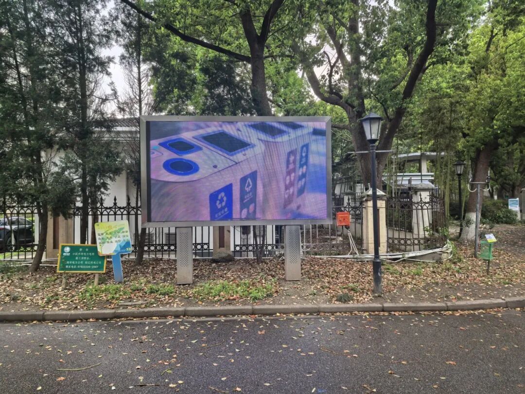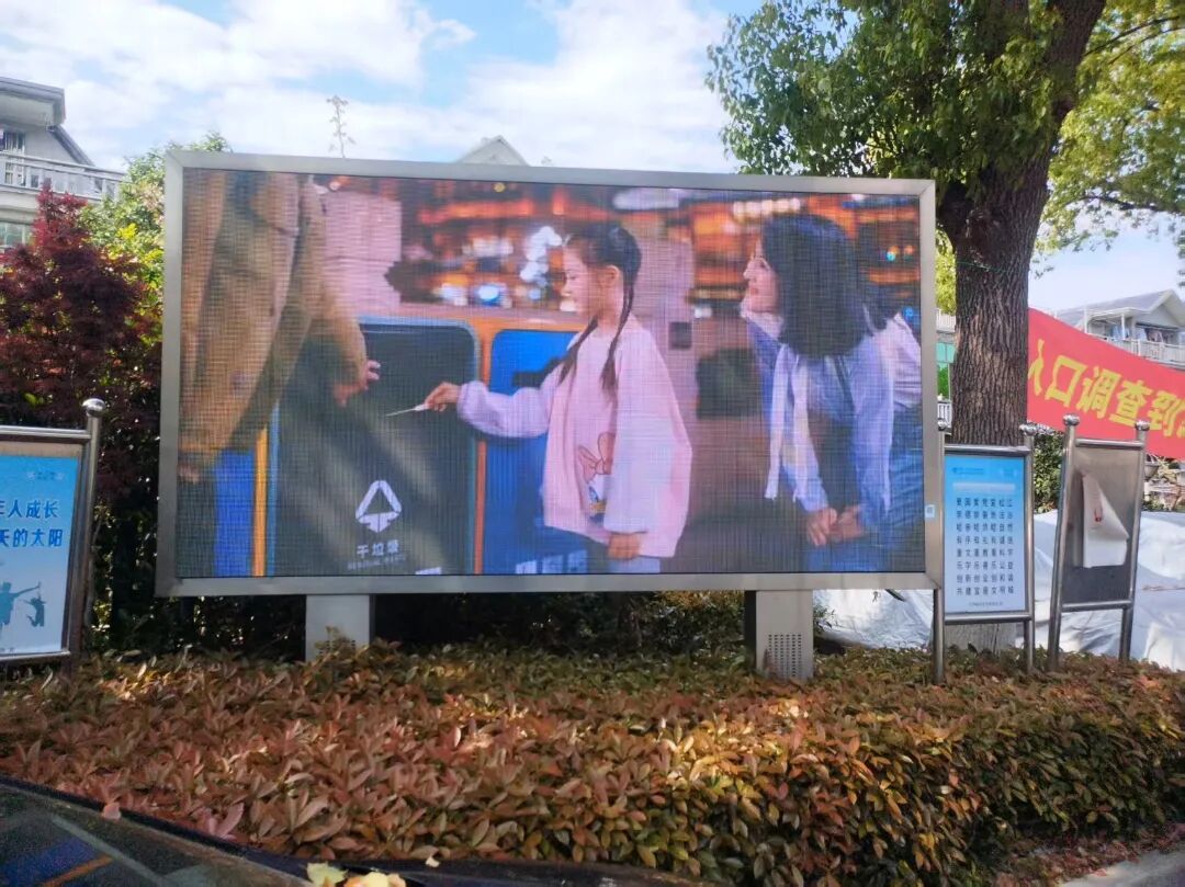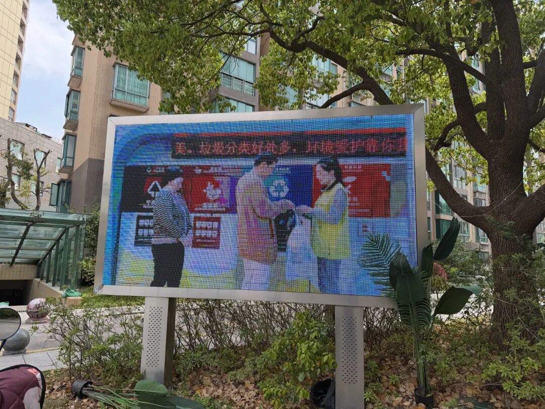 社区坚持线上线下联动,拓宽垃圾分类宣传覆盖面。线下依托志愿者开展现场引导,线上充分利用小区门口电子显示屏,滚动播放垃圾分类科普视频,以直观生动的形式,让居民在日常出入中随时随地学习分类知识、强化分类意识,让垃圾分类理念融入居民日常。