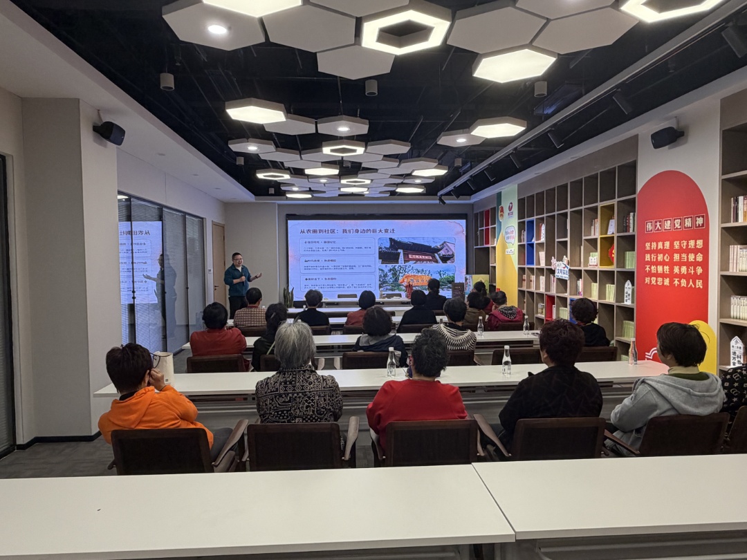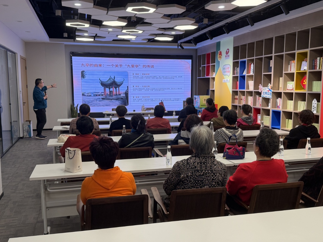 活动伊始,专业科普老师带领大家共同回忆九亭镇的变迁历史,由蒲汇塘边九里亭的传说讲起,从遍地农田到高楼林立、从被污染的臭水河到美丽的九科绿洲,一段段往事唤起了大家深藏心底的集体记忆。老人们认真聆听,不时互动交流,现场气氛温馨而热烈。