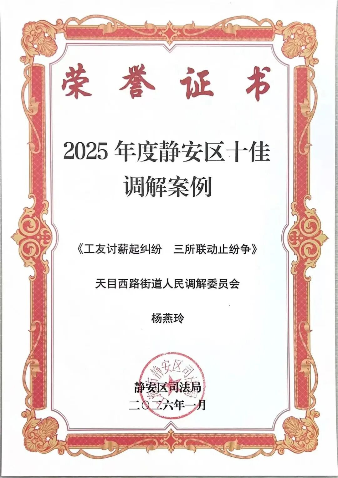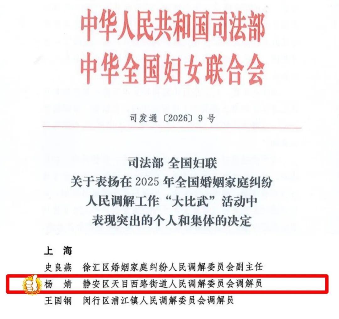 近日,天目西路街道再添亮眼成绩:街道人民调解委员会调解员杨婧荣获司法部、全国妇联联合表扬,成为上海市获此殊荣的三名优秀调解员之一;同时,街道报送的“三所联动”案例获评2025年度“静安区十佳调解案例”。双重喜讯的背后,是天目西路街道深耕基层法治建设、践行新时代“枫桥经验”的生动缩影。