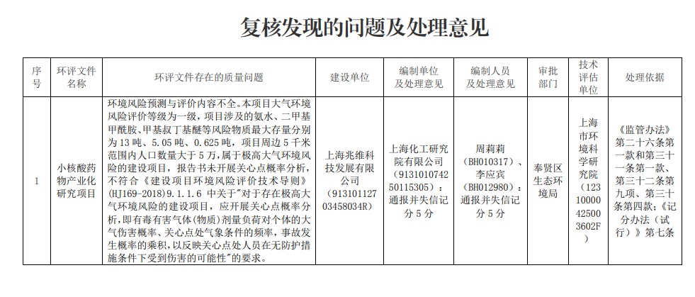 生态环境部在环评文件质量复核中发现奉贤区生态环境局审批的《小核酸药物产业化研究项目环境影响报告书》(以下简称《报告书》)存在质量问题,要求我局组织开展进一步复核并处理,现将相关问题和处理意见通报如下: