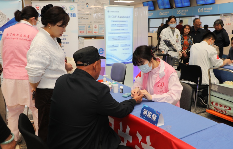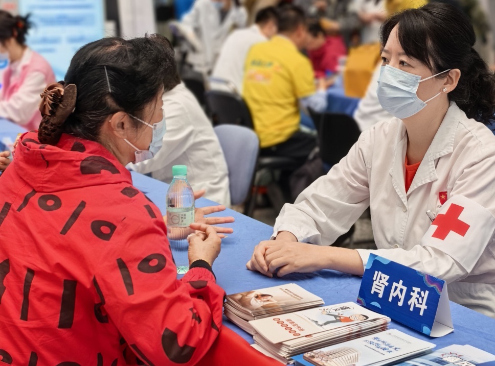 在免费检测区,肾内科护理团队正在为市民有序进行血尿酸、血压、血糖检测。“来,轻轻按一下,五分钟就出结果。”护士一边熟练地为市民采血,一边安抚紧张的老人。检测结果出来后,专家现场逐一解读。