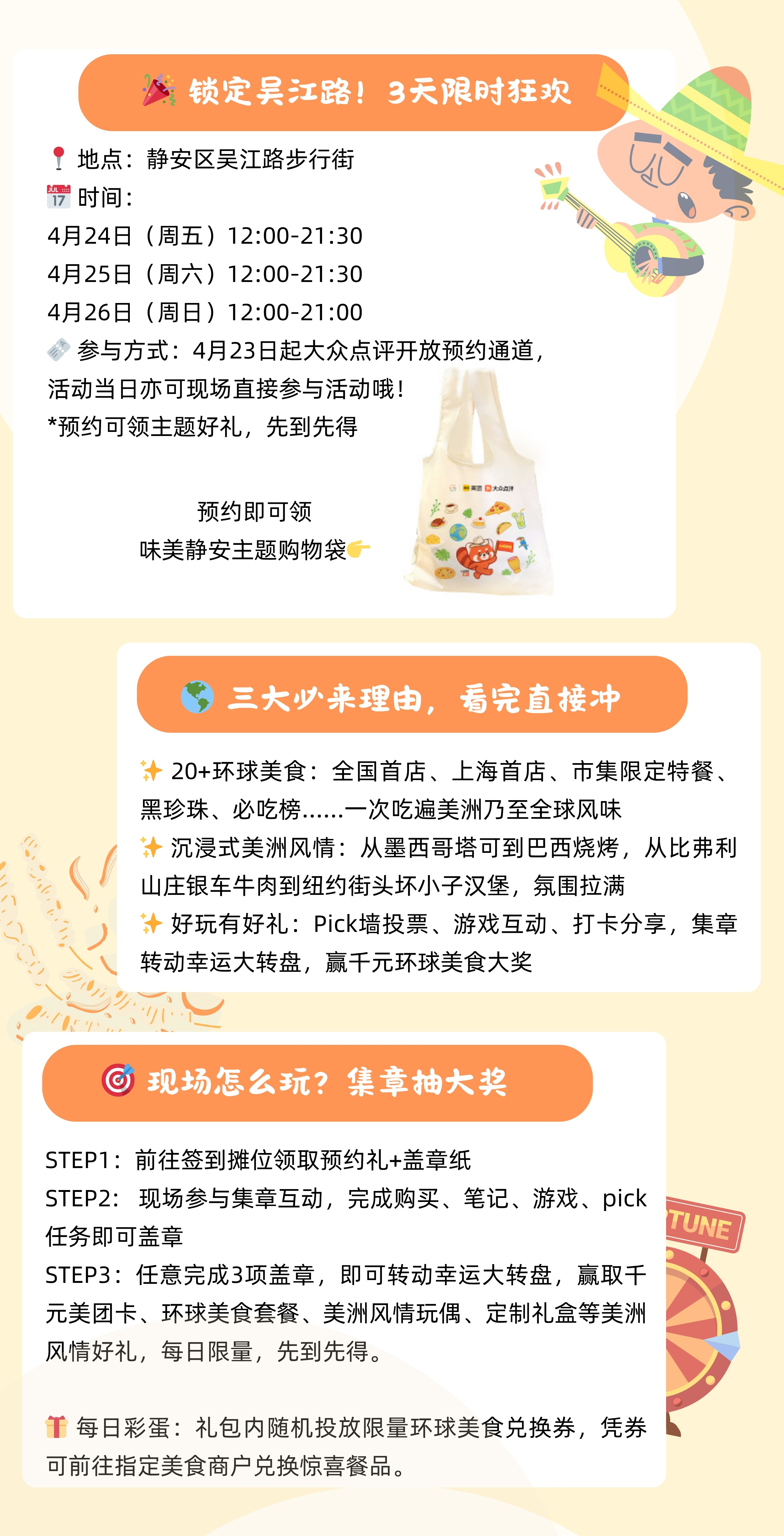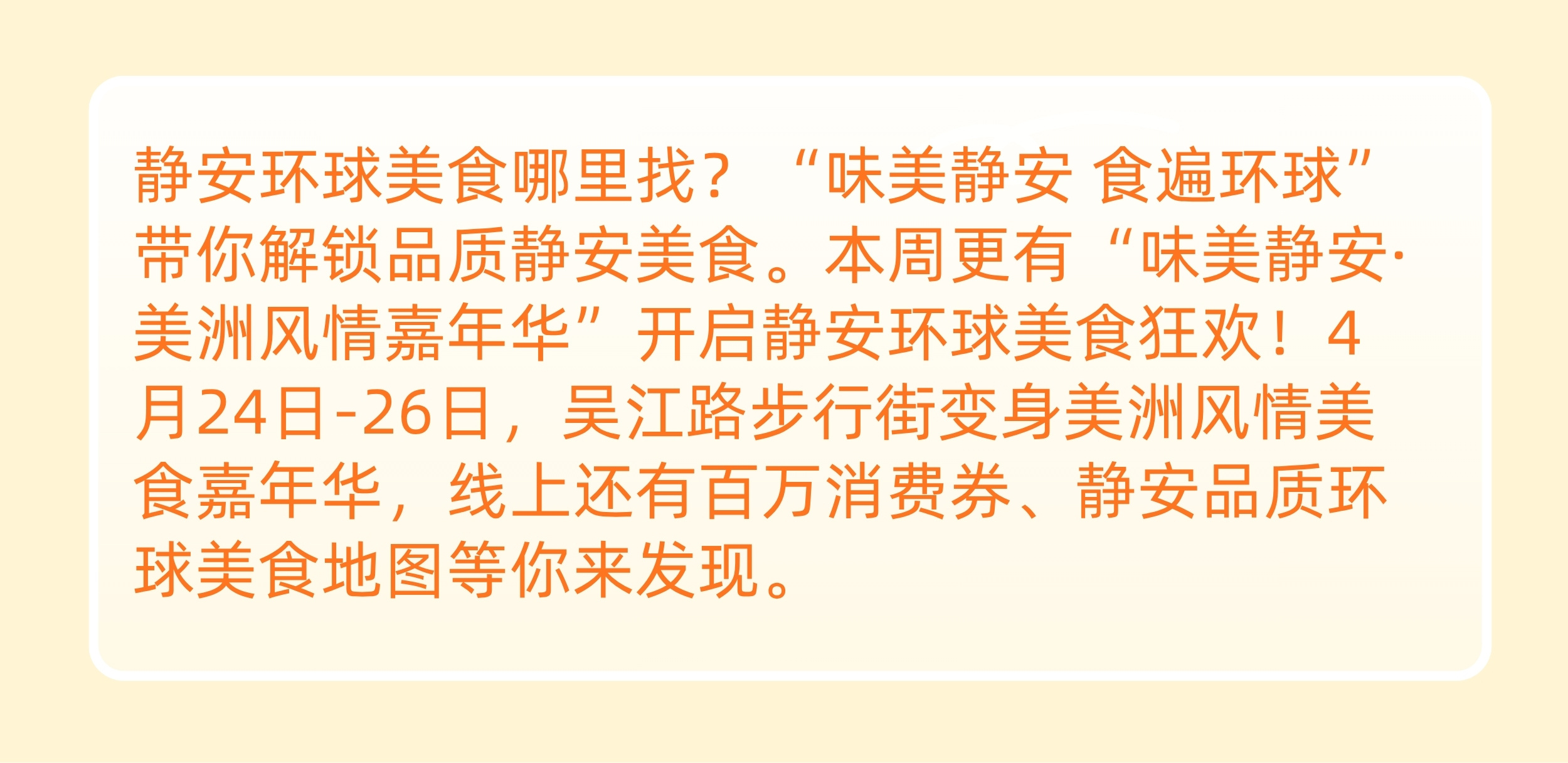 为进一步激活消费市场,市政府推出“2026上海环球美食汇”这一年度活动。“2026上海环球美食汇”第二季度活动以美洲风味为主题,静安区将于4月24日至4月26日在吴江路举办“味美静安·美洲风情嘉年华”美食市集。