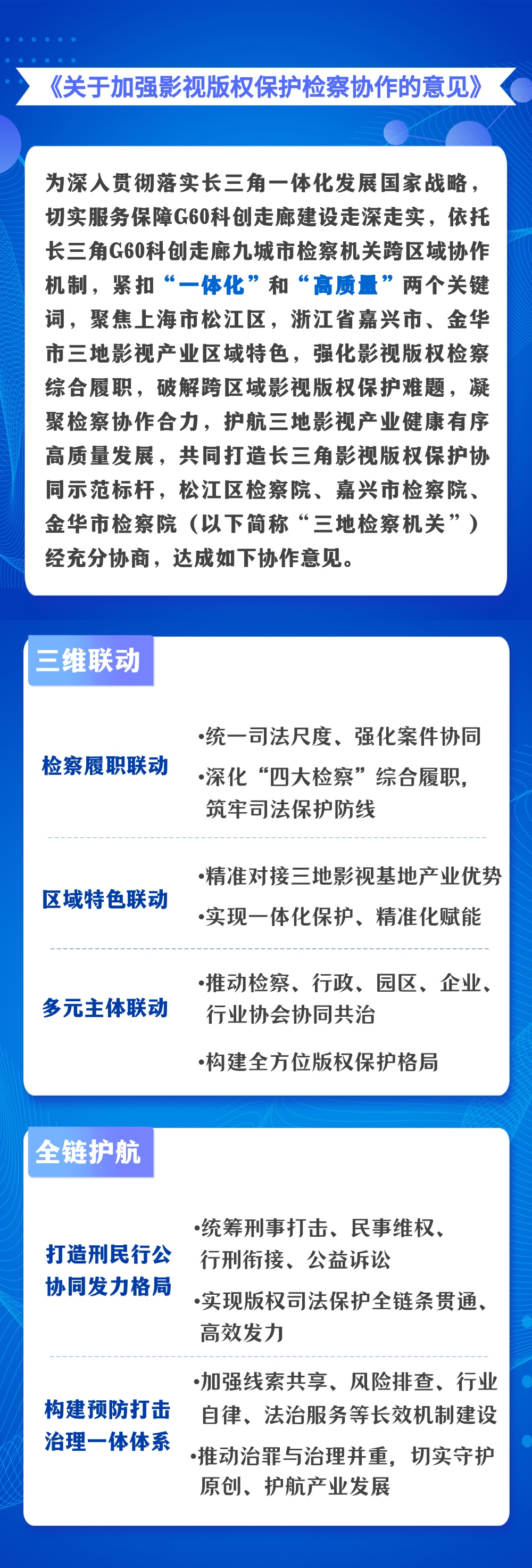 长三角G60科创走廊影视版权保护检察协作联盟正式启动,这既是凝聚多方合力、构建影视版权大保护格局的有益探索,更是服务G60科创走廊建设、助推长三角一体化发展的创新实践。希望三地检察机关持续深化协作机制、细化务实举措,不断提升跨区域影视版权和知识产权检察保护质效,助力长三角一体化发展迈向更高水平。