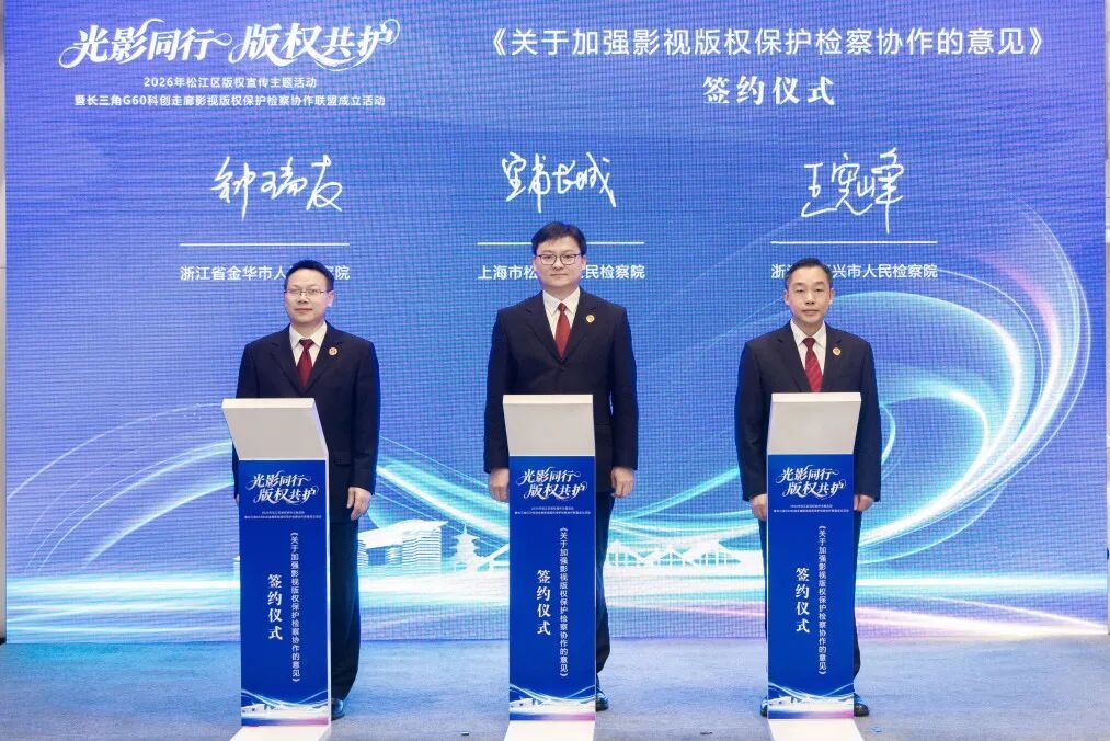 三地检察机关共同会签《关于加强影视版权保护检察协作的意见》。该协作意见由三地检察机关广泛搜集影视版权典型案例,结合一线走访调研情况,深入研判行业痛点与司法需求后共同撰写形成,标志着长三角 G60 科创走廊影视版权保护检察协作联盟正式落地。