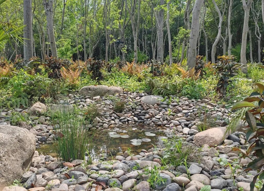 “一般城市景观的水系驳岸是硬质的,不太便于两栖类动物和小型的鸟类、哺乳动物利用,所以我们设计了三个小水塘。”项目设计师表示,生态水塘区是青蛙、蟾蜍等两栖动物繁殖和成长的摇篮,“水塘的坡度较缓、深度较浅,既可以方便小动物们饮水,也能给两栖类动物提供冬眠的巢穴。”