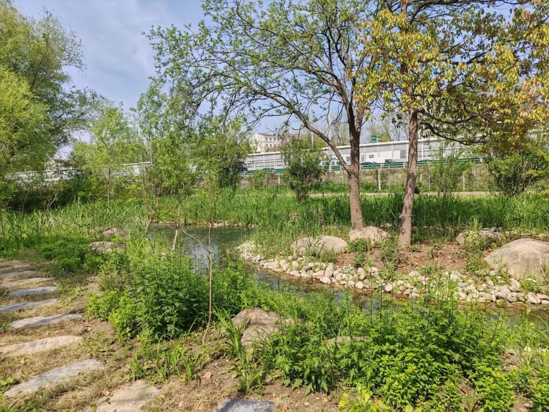 借助外环西河水系,这一空间里的乡土湿生植物滨水带在自然石块间引种和展示乡土湿生植物,模拟水陆过渡区的自然演替。