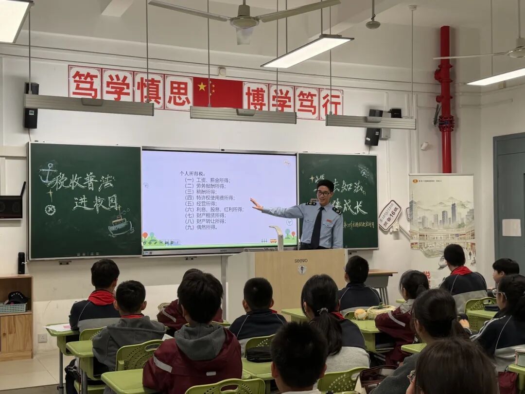 第四稽查局走进上海市进才中学北校为学生们开展税收普法进校园活动,从奶茶增值税的链条解析到发票维权小知识,丰富的形式让严肃的税法变得鲜活易懂,税务青年送上“责任、智慧、担当”三个关键词,鼓励同学们争做税法宣传员,帮助青少年树立正确的税收观念。
