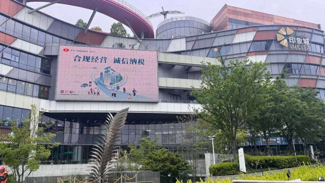 嘉定区税务局依托南翔印象城商圈人流密集、位置优越的特点,通过户外大屏滚动展播第35个全国税收宣传月主题海报与标语,营造浓厚的依法纳税社会氛围。