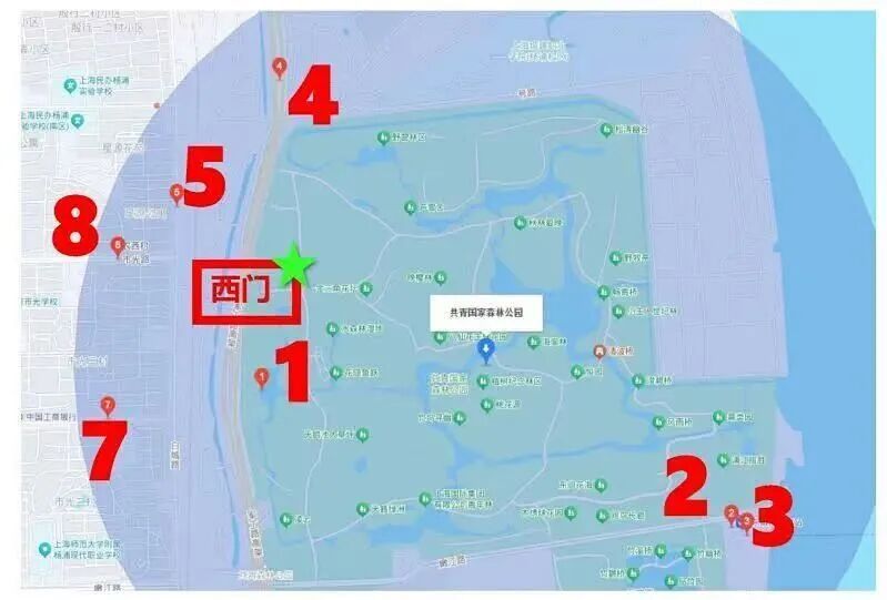 从地铁8号线市光路站2号口到共青森林公园西门约1.6公里。为避免拥堵,您可选择步行、慢跑或骑共享单车前往。