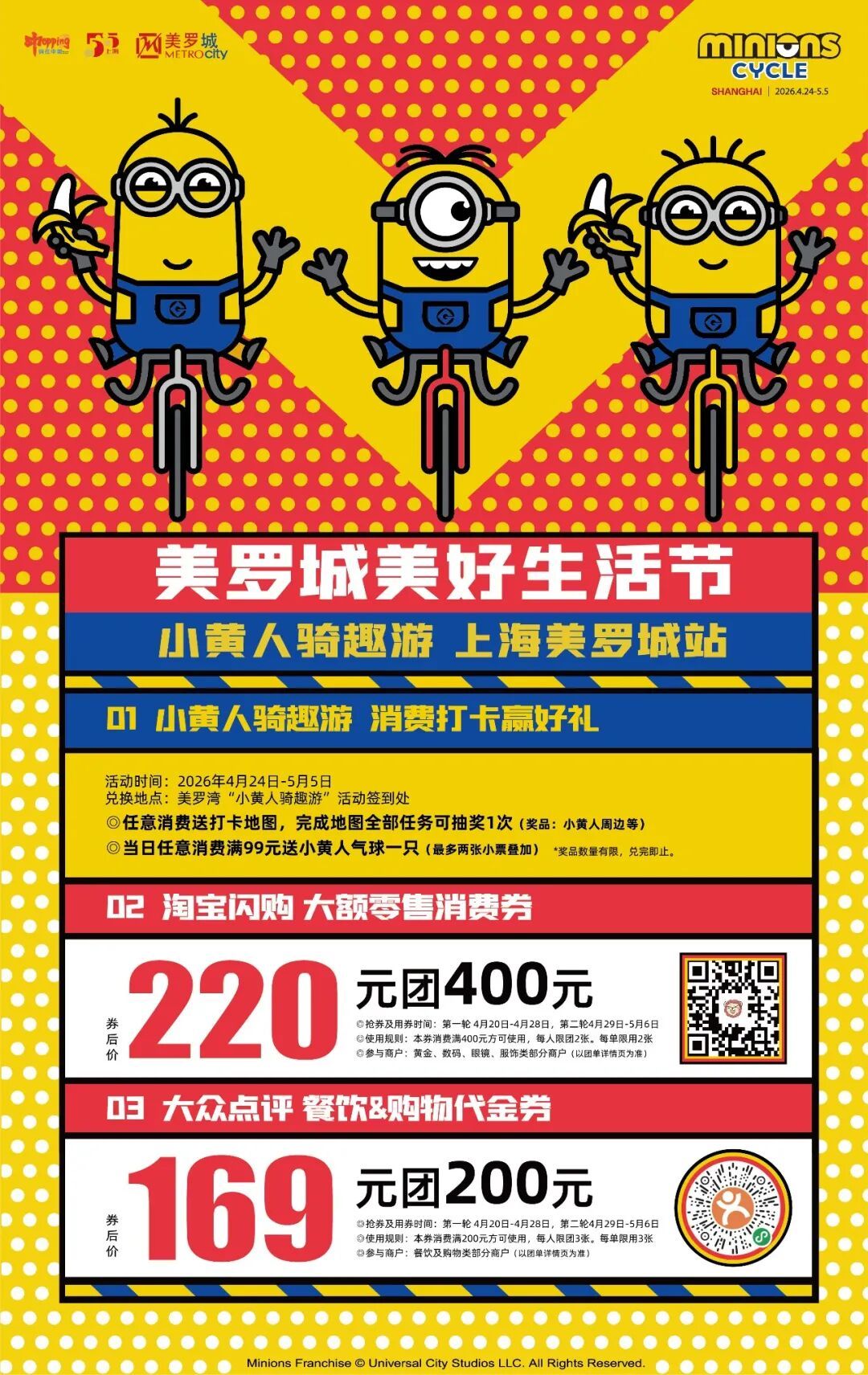 为进一步回馈消费者,美罗城同步推出系列惠民促销活动,活动周期覆盖4月20日至5月6日。消费者可通过淘宝平台参与220元团400元零售券活动,也可在大众点评抢购169元团200元全场通兑券,两大优惠券均可在指定商户使用。同时,活动期间任意消费即可领取专属打卡地图,完成打卡任务即可参与抽奖;当日单笔消费满99元,还能获赠小黄人气球,多重福利助力市民畅享美好春日时光。