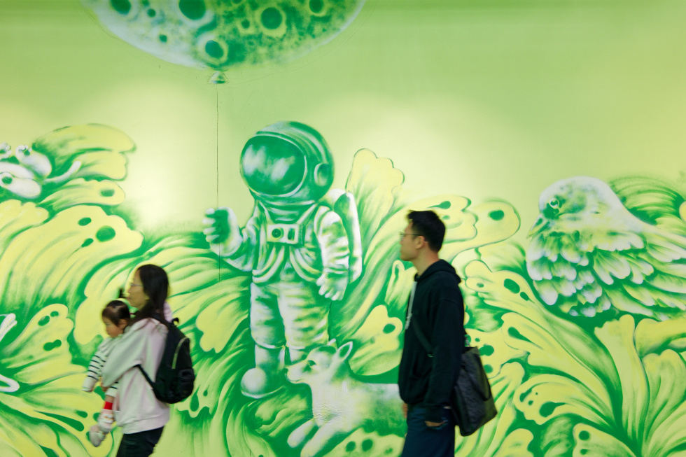 展览中呈现了施政以宇航员为题材的2件作品。在他的笔下,宇宙不再漆黑,而是呈现出亮绿色、亮黄色。戴着头盔的宇航员看不见面容,身形如同孩童。“在宇宙中漂浮意味着自由自在,却也蕴含着孤独。当一个人戴着头盔,也会隐藏自己的喜怒哀乐。”施政在这些看似矛盾的笔调背后,描绘出孩童眼中五彩斑斓的宇宙,为整个画面增添了一抹温情,“童年时期,我们对世界的看法充满友善,如果能够把这种感觉保持到成年,是一件非常宝贵的事情。”