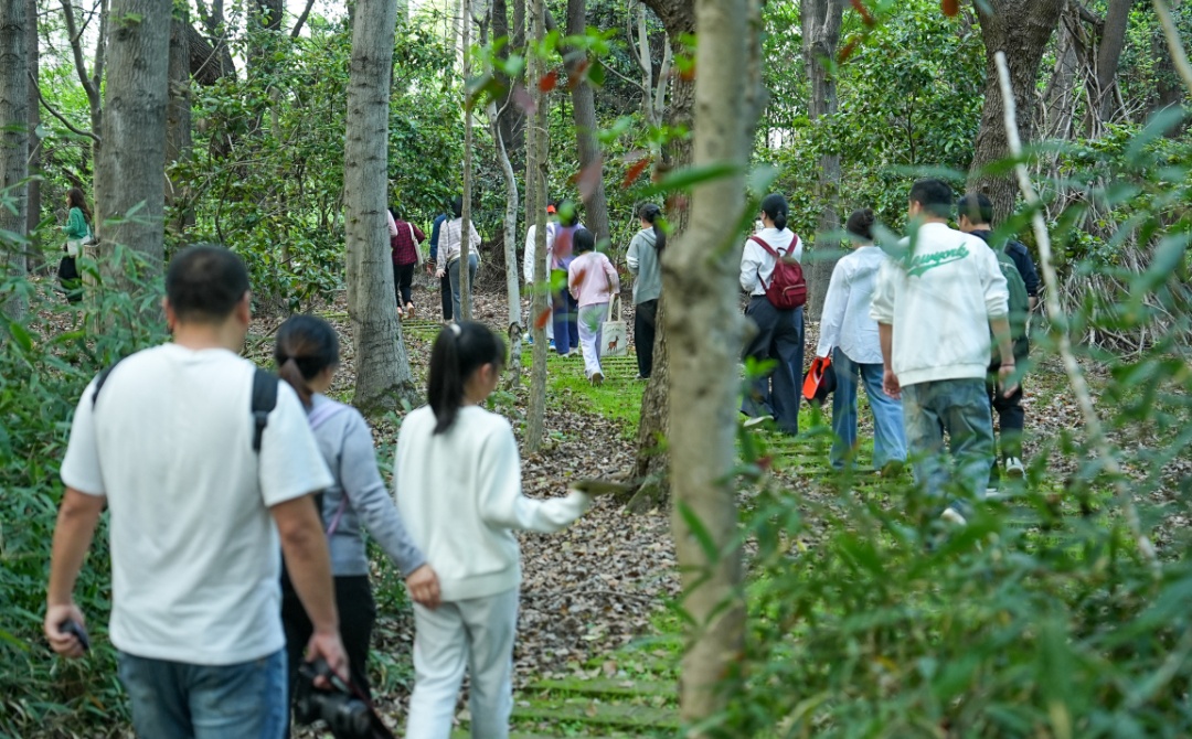随后大家走进小森林,开启寻找獐的探索环节。在林间步道,亲子家庭仔细观察、轻声探寻,学习识别獐的活动痕迹,近距离感受栖息地的生态环境。孩子们积极提问互动,在趣味探索中认识到野生动物与生态环境的紧密联系,萌发了守护本土物种、保护生态家园的责任感。