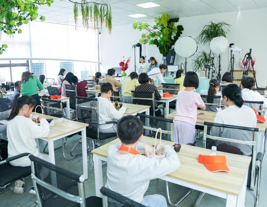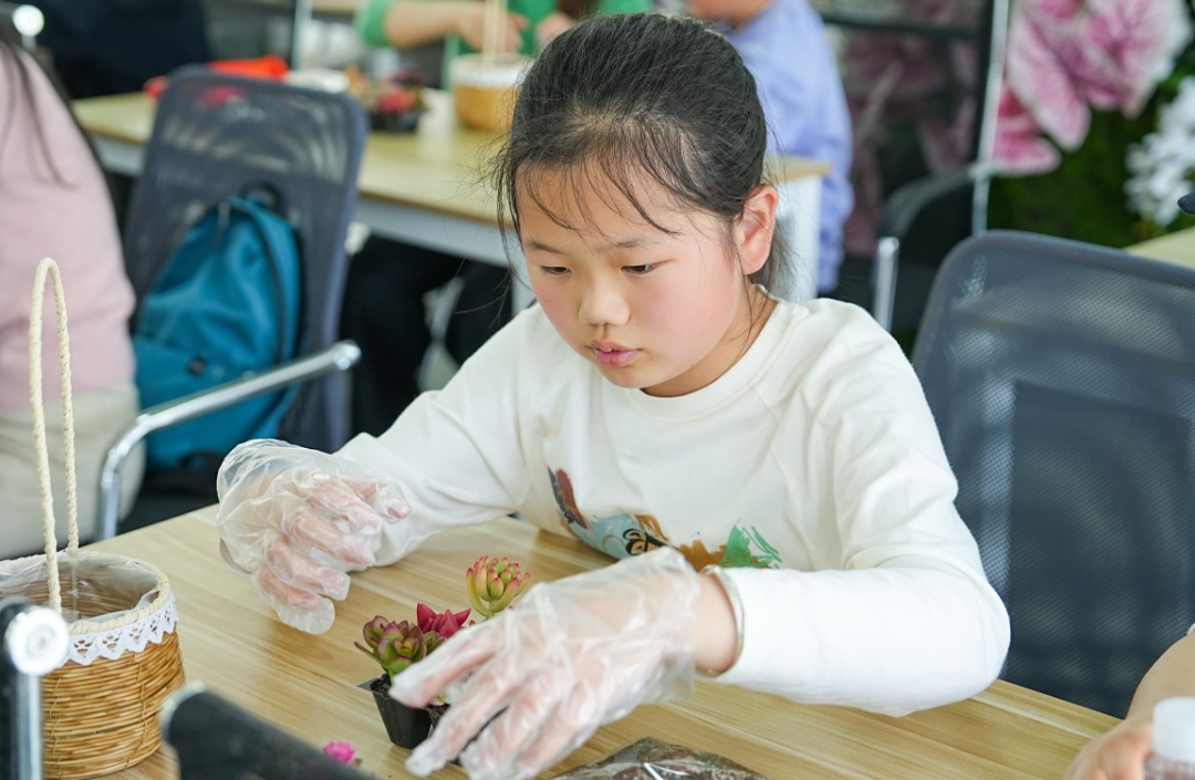 在讲解员的指导下,孩子们挑选多肉植物、搭配营养土、栽种入盆,制作专属的 “绿色小花篮”。通过亲手种植,孩子们不仅掌握了基础的植物养护技巧,更体会到每一株植物的生长都需要耐心与呵护,树立了爱护绿植、尊重自然的意识。