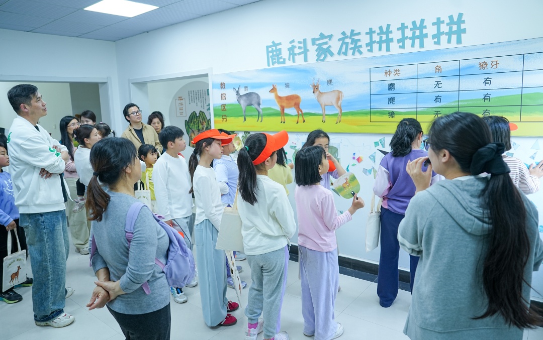 研学队伍抵达第二站——叶榭獐极小种群恢复与野放栖息地。现场工作人员为亲子家庭带来了一堂生动的互动科普课,结合獐的生活习性、种群保护现状,讲解叶榭獐种群恢复的生态意义,以及松江在生物多样性保护工作中的实践与成果。