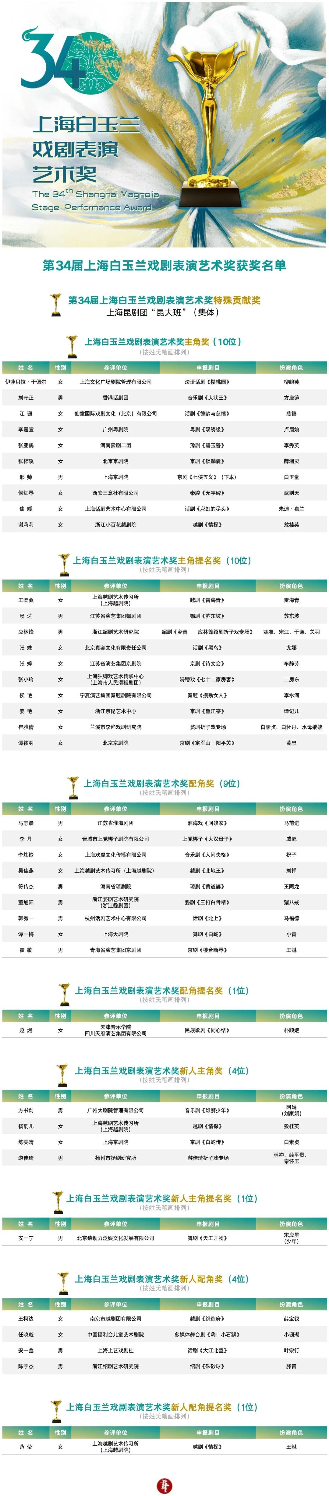 在第34届白玉兰戏剧奖的各奖项角逐中,伊莎贝拉·于佩尔、刘守正、江珊、李嘉宜、张亚鸽、张梓溪、郝帅、侯红琴、焦媛、谢莉莉(按姓氏笔画排序)获主角奖,马志晨、李丹、李炜铃、吴佳燕、符传杰、董旭阳、韩秀一、谭一梅、霍敏(按姓氏笔画排序)获配角奖。方书剑、杨韵儿、炼雯晴、游佳琦(按姓氏笔画排序)获新人主角奖,王柯边、任晓璇、安一鑫、陈宇杰(按姓氏笔画排序)获新人配角奖。完整名单见下: