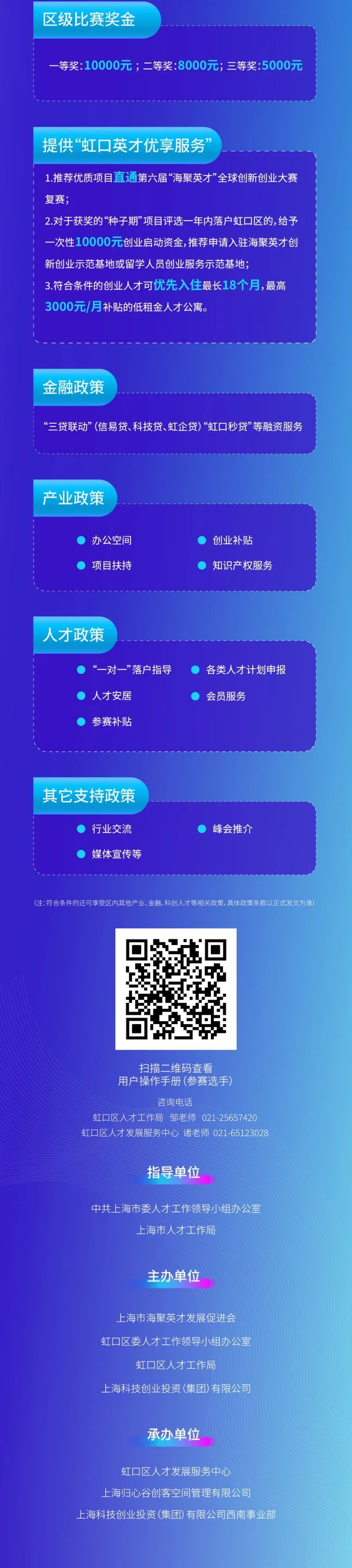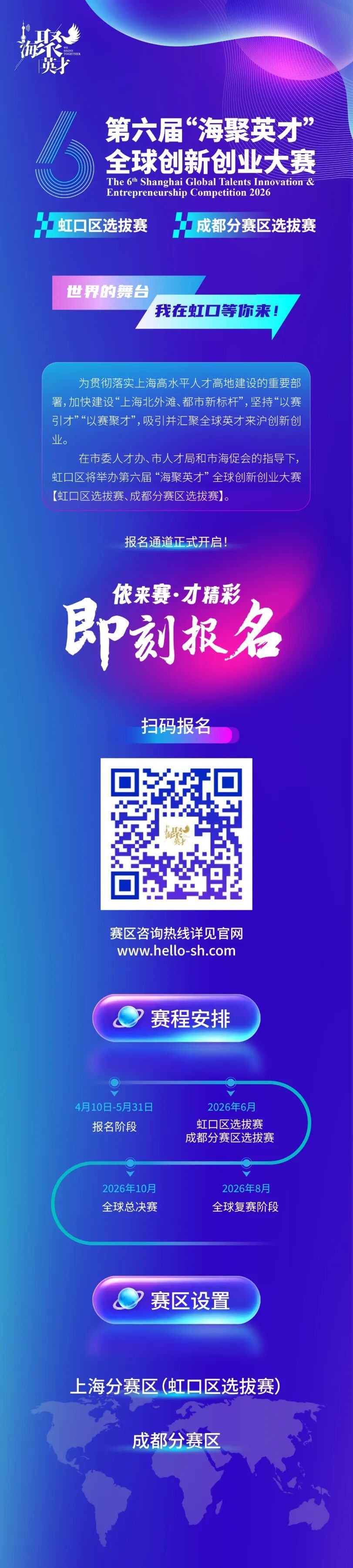 第六届“海聚英才”全球创新创业大赛虹口区选拔赛、成都分赛区选拔赛即将举办,即日起至5月31日开始报名,超丰厚的市级和区级奖励政策等着你。详见↓