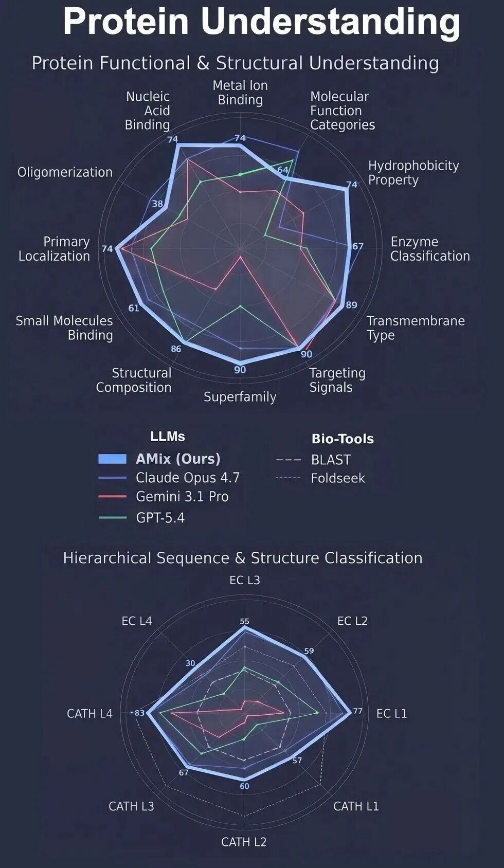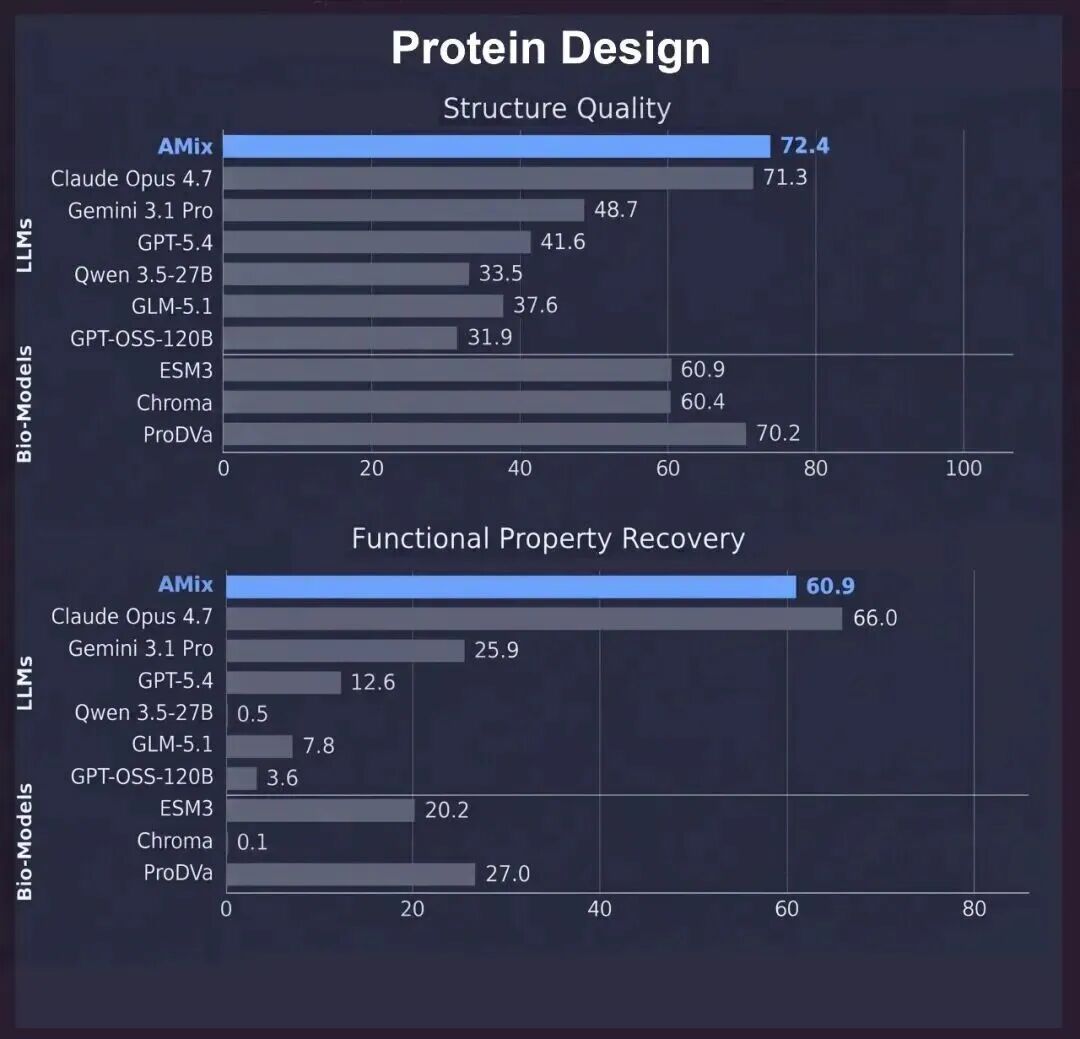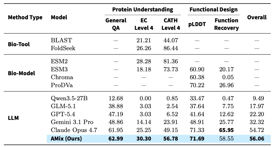 书生AMix首次展现出跨越蛋白原生理解与设计模态鸿沟的基座级能力,在覆盖16类核心任务的通用蛋白质问答上准确率超越Claude Opus 4.7,位居榜单第一;
