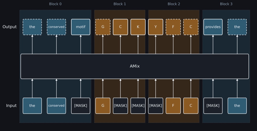 值得关注的是,书生AMix采用块级扩散(Block-wise Diffusion)范式,其核心机制为“块间因果约束、块内双向扩散”:在数据块之间维持从左到右的依赖约束,保障蛋白质序列的全局连贯性与生成质量;在数据块内部,通过扩散过程实现迭代去噪,使模型能够同步感知局部关键功能区域的前后文约束,兼顾了自回归模型的高质量逻辑与扩散模型的并行高效优势。