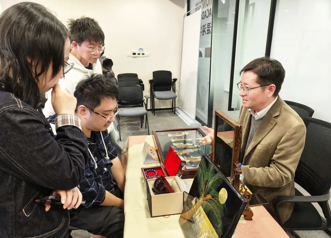 活动现场,上海市级非遗项目代表性传承人俞平,正在向20家游戏公司代表介绍自己的漆器制作技艺和俞氏百宝镶嵌制作技艺,与年轻的游戏制作人探讨合作的可能性。