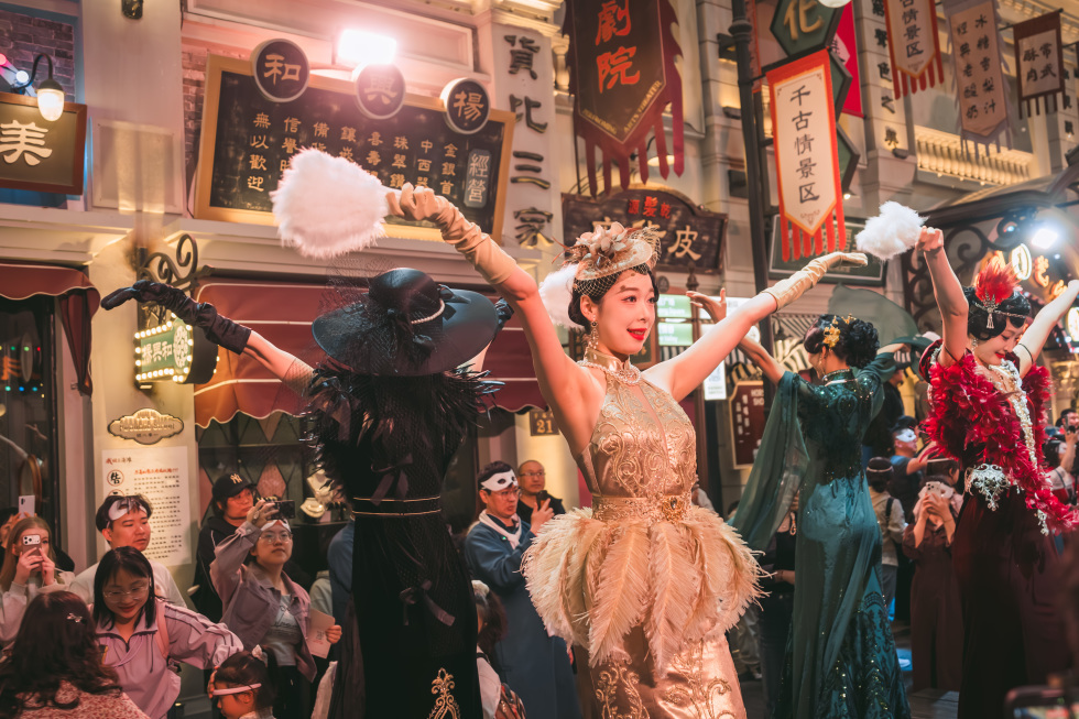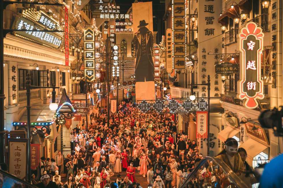 步入一楼的穿越街,老上海风格的招牌亮起霓虹灯,繁华气息扑面而来。游客们戴上神秘面具,不少人换上免费的精美服装,入戏解锁全新身份。