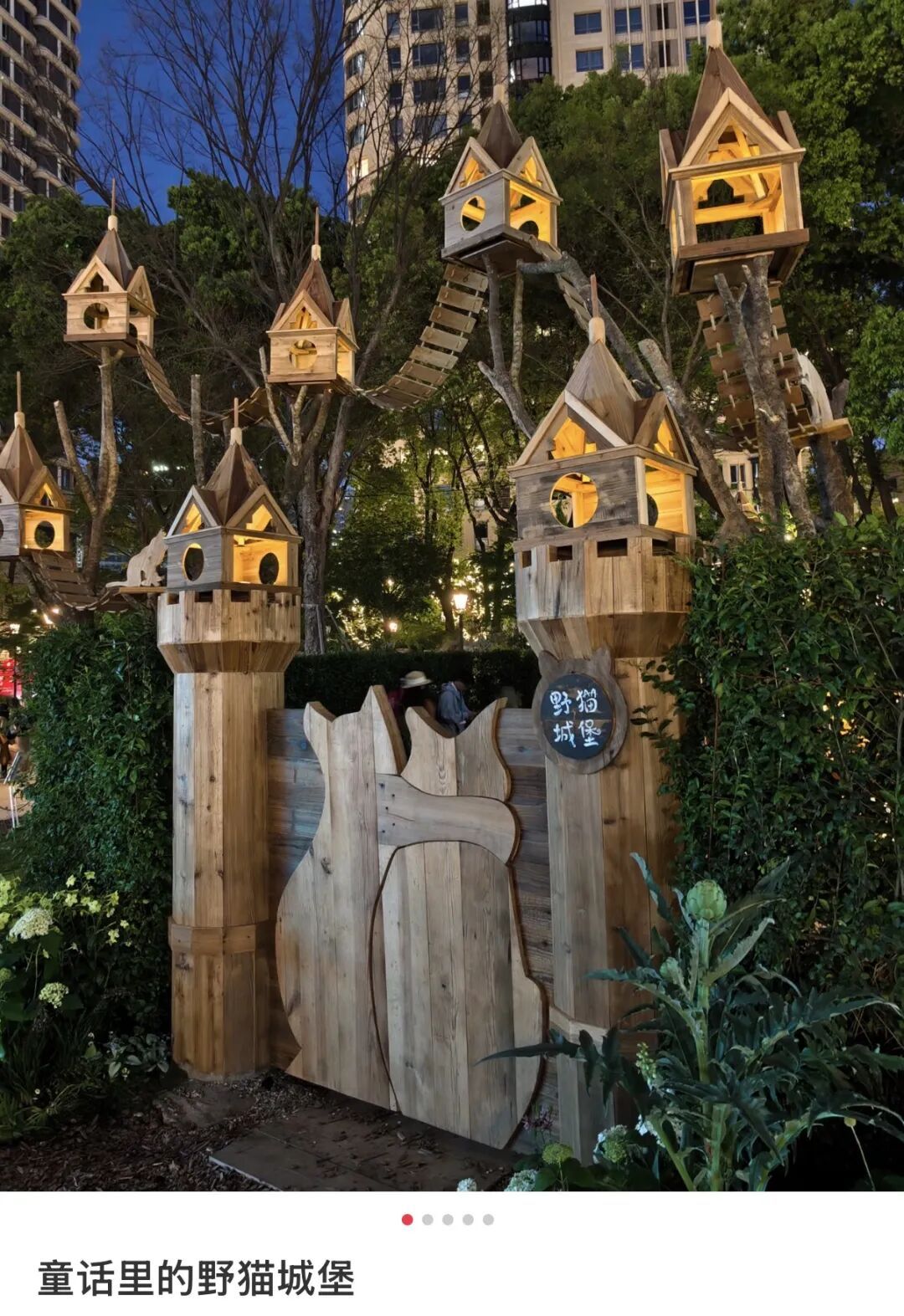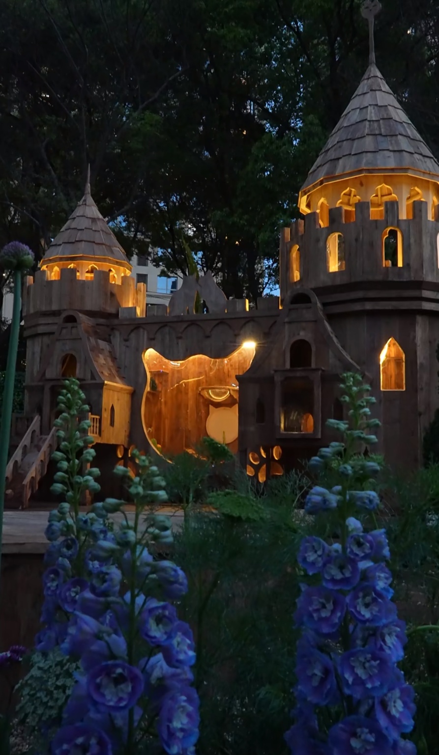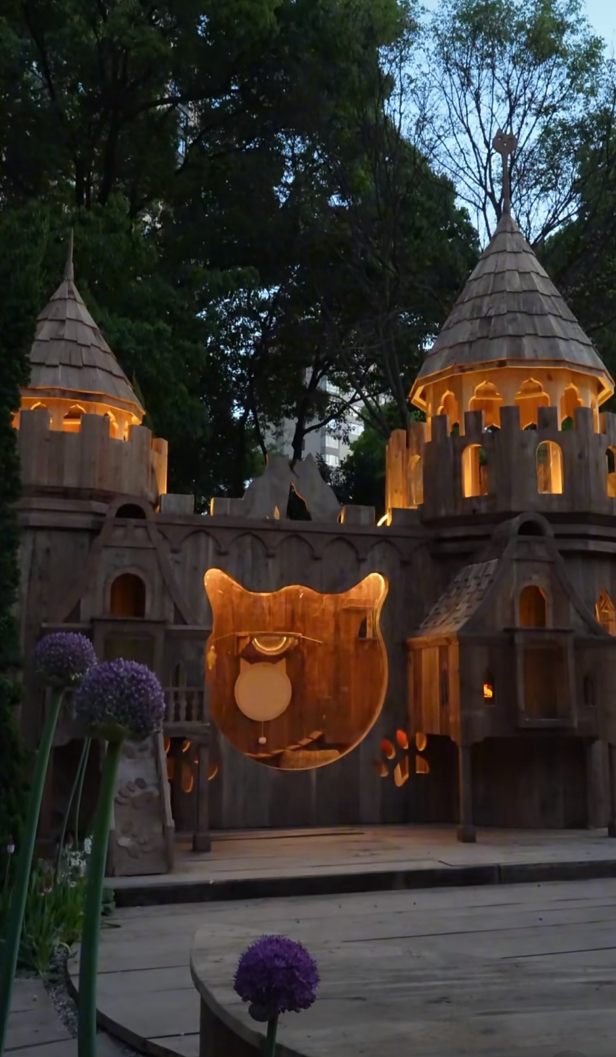 整座木质城堡被暖黄灯光点亮