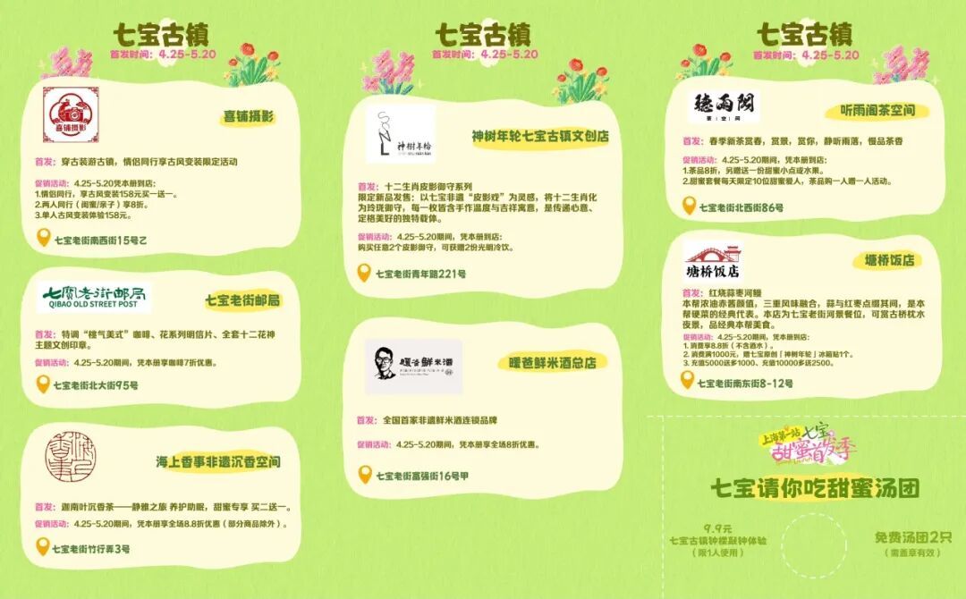 除了“三件套”,古镇内多家商户也备好了甜蜜福利,凭春日寻宝图到店即可享受: