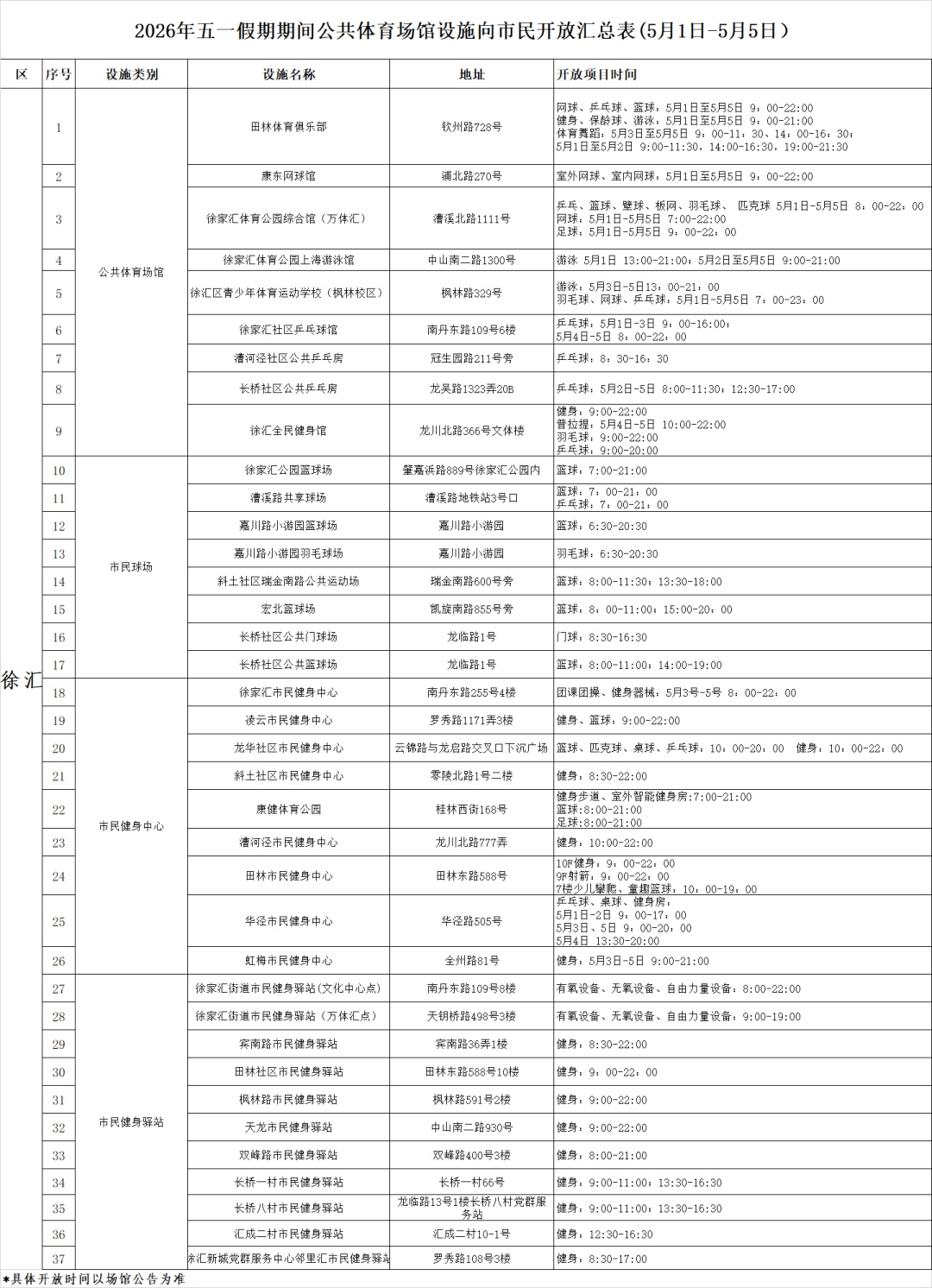 “五一”小长假即将到来,运动休闲正当时!为更好满足市民“五一”假期的健身需求,徐汇区37家公共体育场馆向市民开放,开放项目包括足球、篮球、网球、乒乓球、体育舞蹈、游泳、健身等。一起来看→