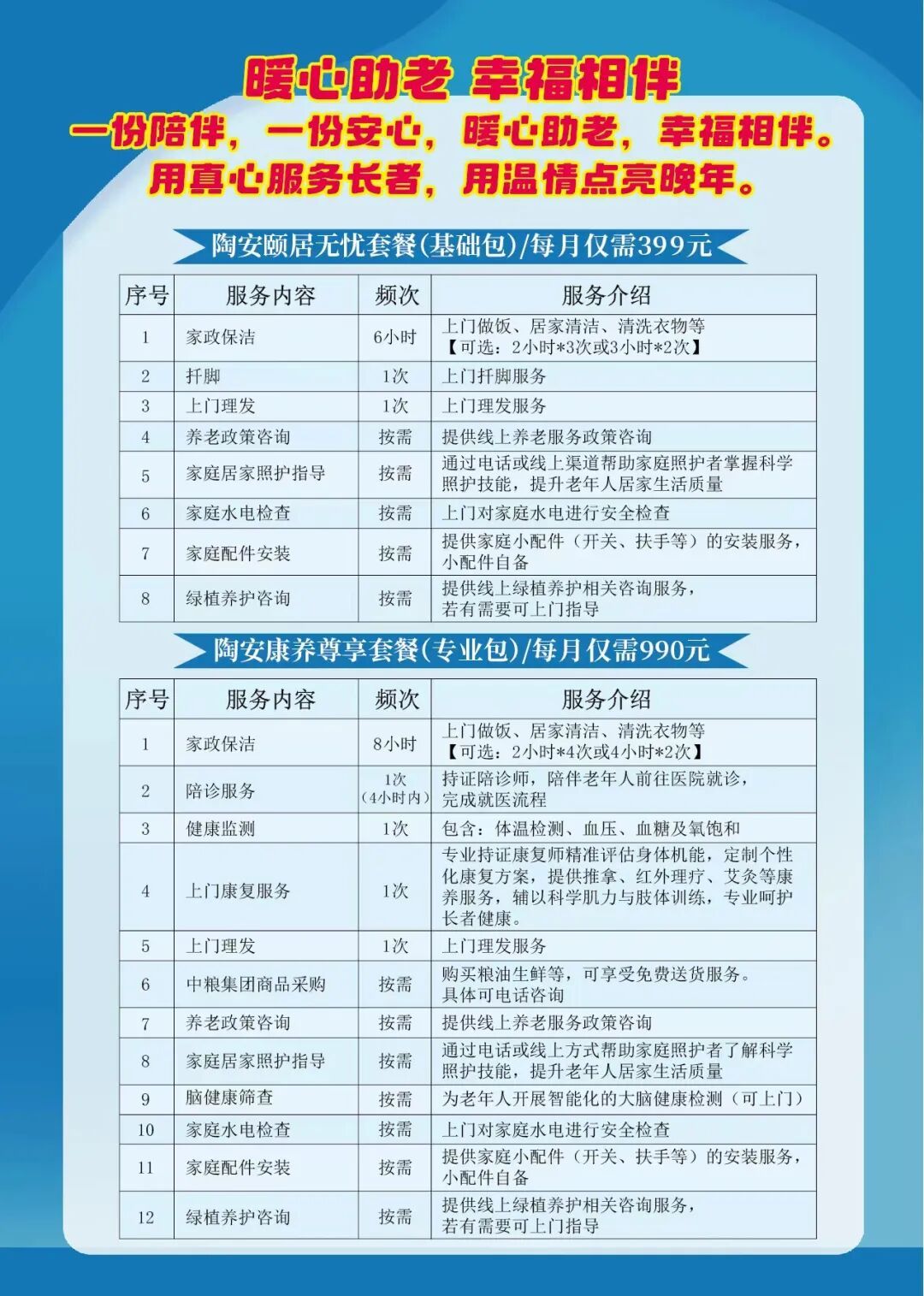 本次推出的服务体系涵盖两大定制套餐与50项全方位服务,精准匹配不同年龄段、不同身体状况老人的需求。其中,陶安颐居无忧基础套餐每月399元,包含家政保洁、理发、扦脚、水电安全检查、绿植养护指导等8项高频刚需服务;陶安康养尊享套餐每月990元,聚焦康养与专业照护,提供12项高品质服务。
