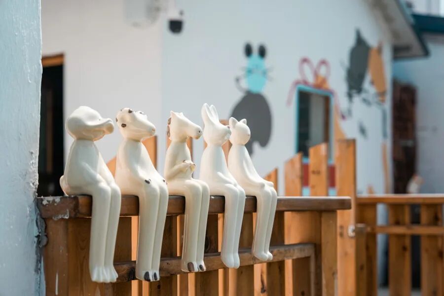 在马门村,艺术并非高高在上的展品,更强调共创、共享、共乐。进村小路正对着的一面墙上,有同济大学俞泳教授、他的“老外”学生、村民、艺术家、游客等共同创作的一幅透视图,村里小狗也留下了四枚小脚印。小路边随处可见的拴马桩上,陶艺小马憨态可掬,有的四脚朝天、有的俏皮昂首,这些都是艺术家与孩子们一起动手完成的……