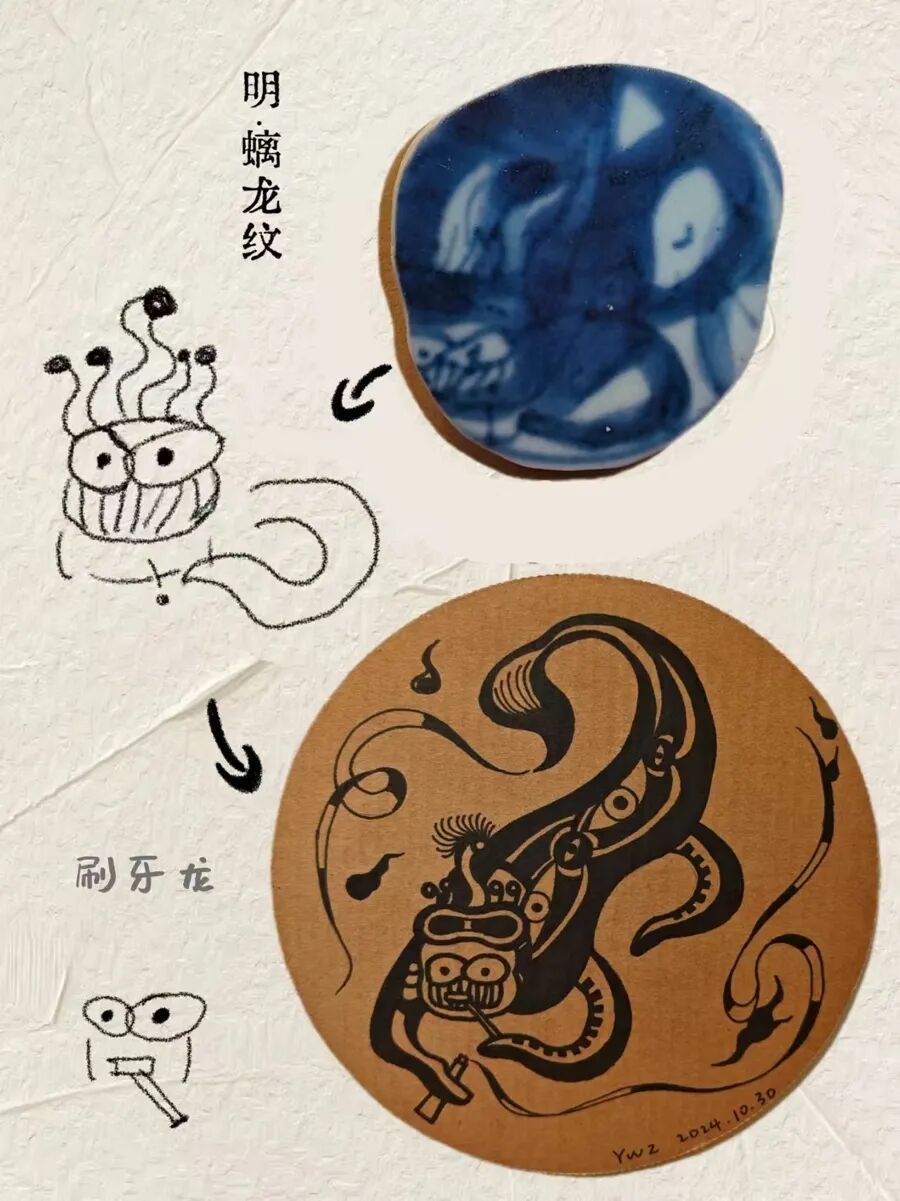 初到马门村,尹文正就被发达的水网与厚重的历史吸引。闲暇时,他总爱在雨后的河岸边捡拾瓷片,从中汲取灵感,开展绘画等二次创作。尹文正已累计收获好几千片,其中一块明代中期的飞马纹青花瓷片,成为这次创作《土观》的核心灵感。“马门村是我艺术创作的转折点,关键就源于这份扎根本土、对话历史的‘在地性’。”尹文正说。