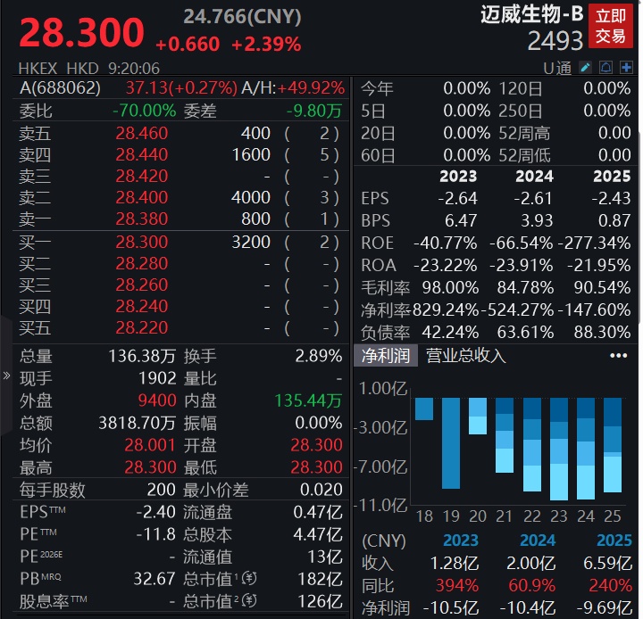 4月28日,港股迈威生物上市首日高开超2%,总市值126亿港元。