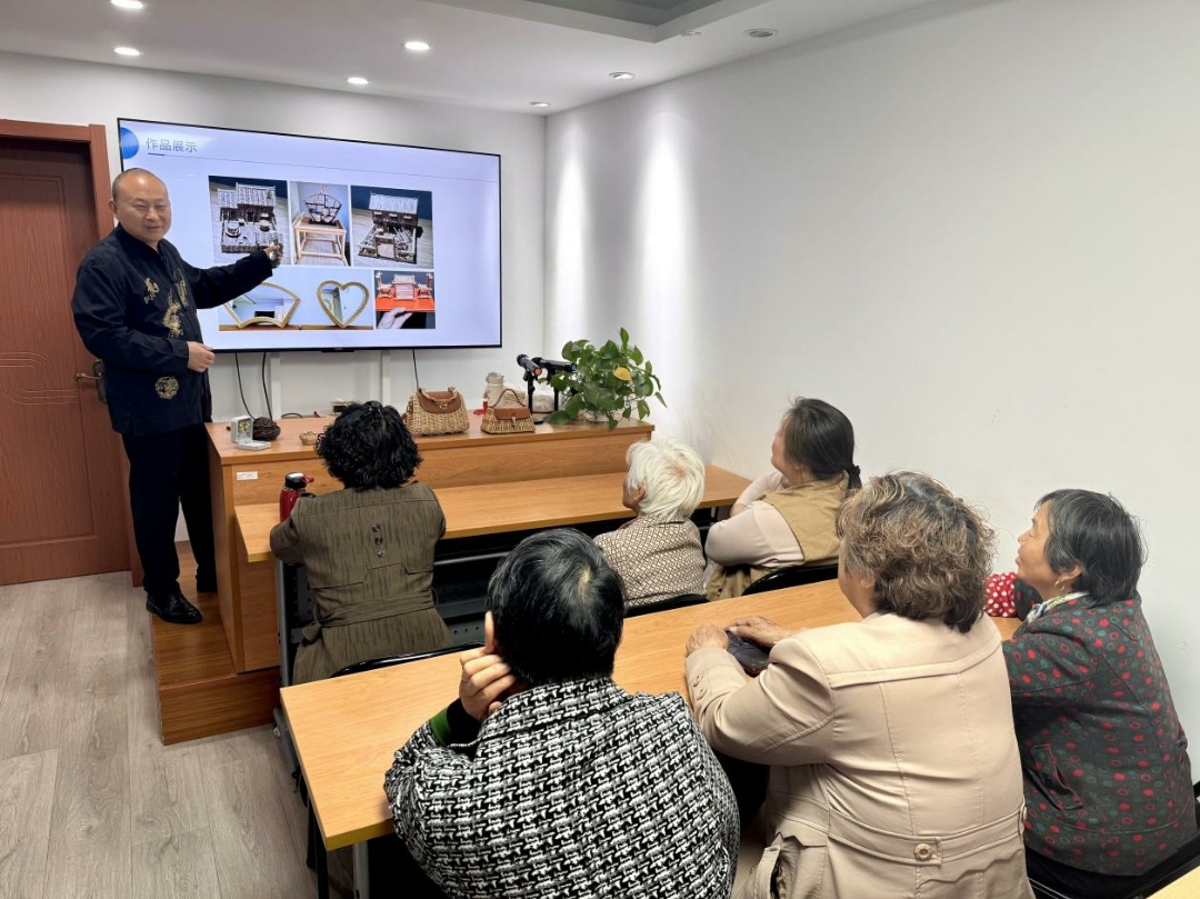 “中国人常说‘南竹北柳’,咱们柳编的主要材料就是‘杞柳’,一般生长于山地河边、湿草地等,主要分布在河北燕山部分、辽宁、吉林、黑龙江的东部及东南部。”刘老师从杞柳的产地分布讲到柳条处理的“泡、削、晾”秘诀,还通过PPT和实物展示了自己以往的经典柳编作品,居民们听得津津有味,时不时提问交流,现场气氛一片火热。
