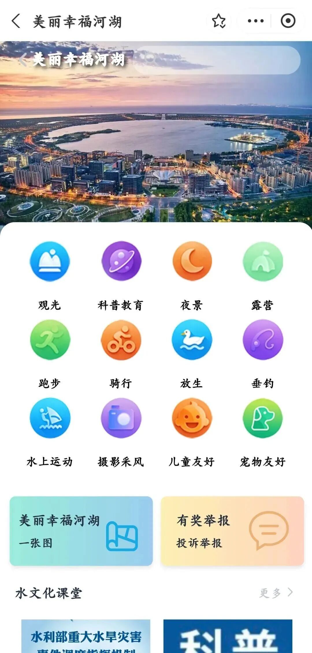市民可以按区域、按类型查找,能看到哪里适合观光、骑行、垂钓、水上运动、科普教育等12项服务功能,实现“一图在手、畅游水岸”。