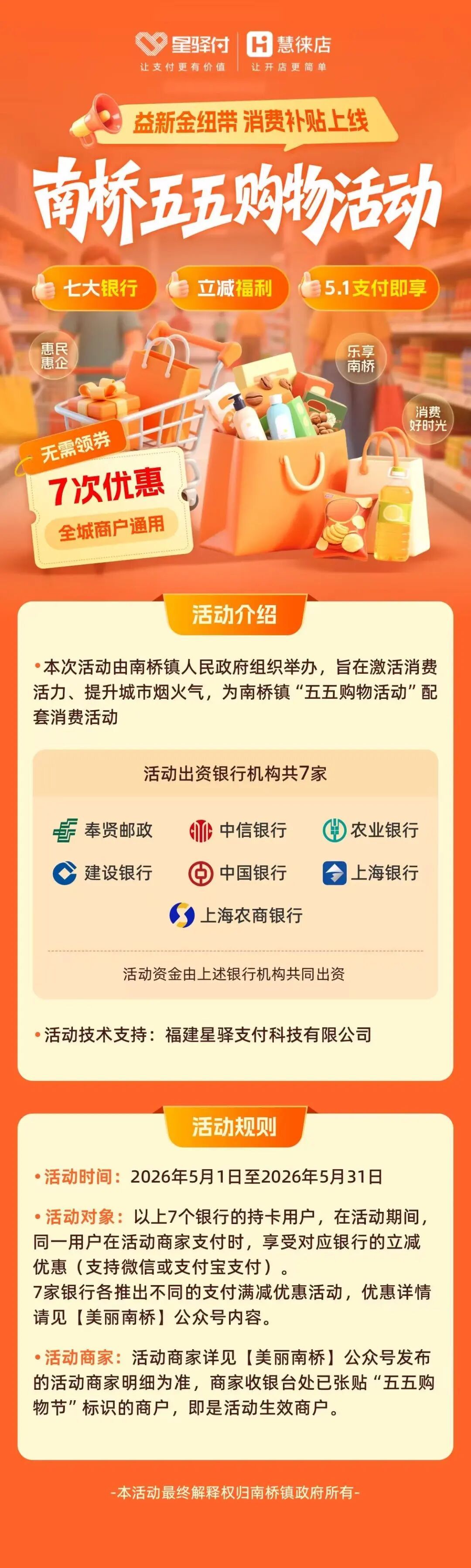 奉贤邮政、中信银行、中国银行、农业银行、建设银行、上海银行、上海农商银行7家银行的任意持卡人。活动期间,同一用户在活动商家支付时,可享受对应银行的立减优惠(支持微信或支付宝支付)。