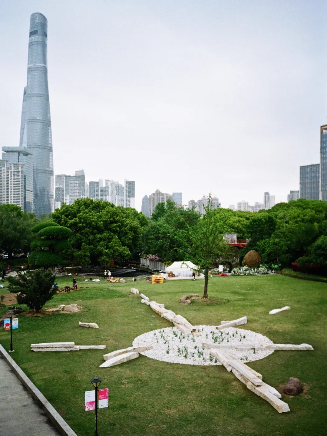 石材的排列让视线有了落脚与延伸之处。最长的石线宛如一条时光主轴,笔直指向远处的陆家嘴天际线——环球金融中心的现代轮廓清晰可辨。这一指,便串联起老城厢的斑驳记忆与浦江对岸的摩登未来。
