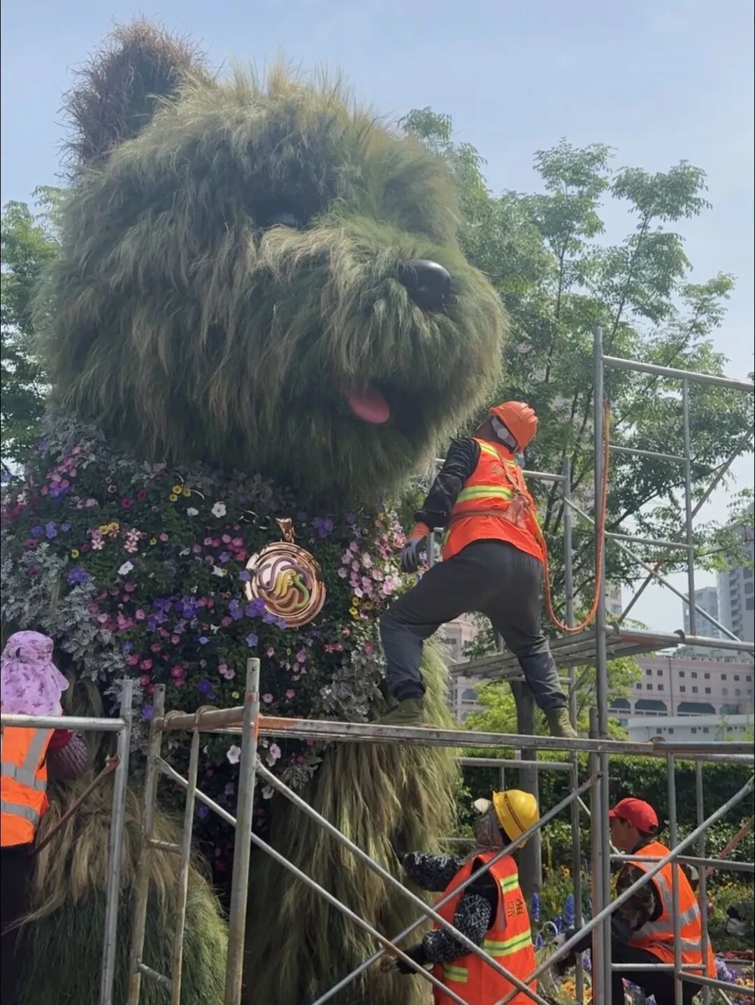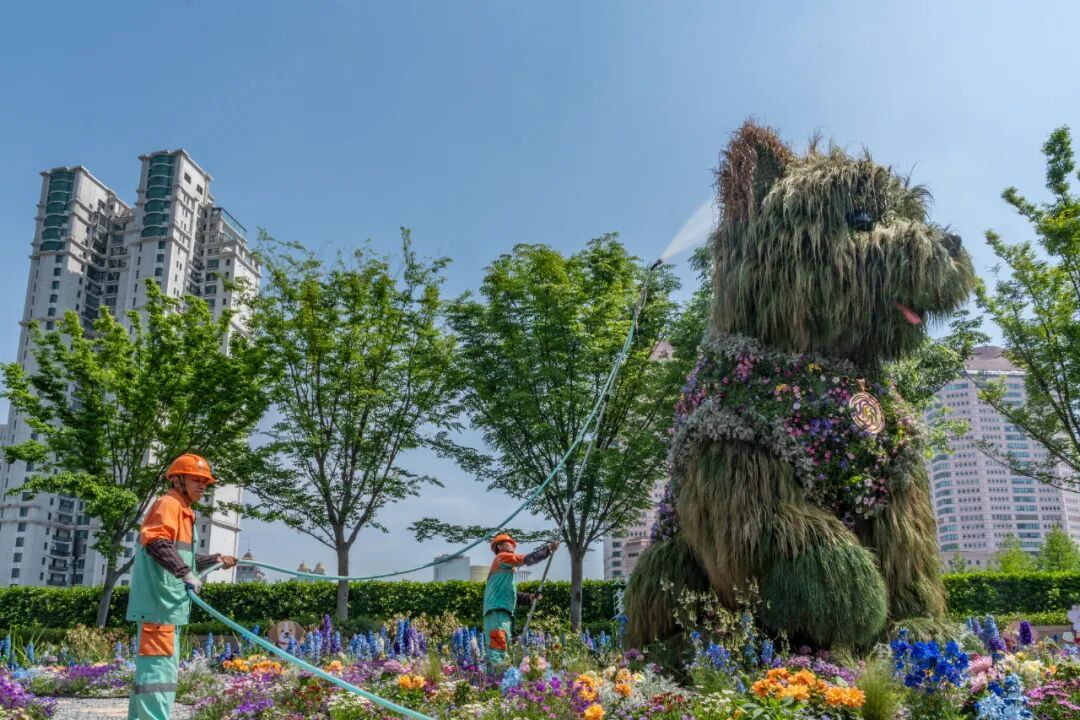 上海绿金绿化养护工程有限公司项目负责人冯瑞介绍,赶在五一客流高峰到来前,换苗、加草、修剪——全套“美容”流程给这只“顶流”小狗安排得明明白白。枯死泛黄的草逐一更换,原本不够饱满的地方补上新苗,让小狗焕然一新的同时显得更毛茸茸,更有层次感。