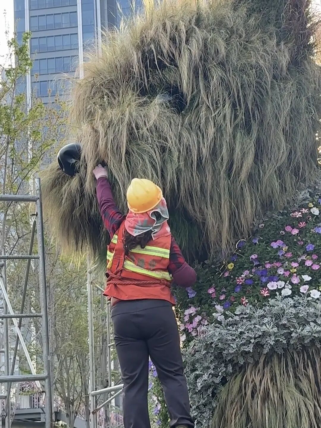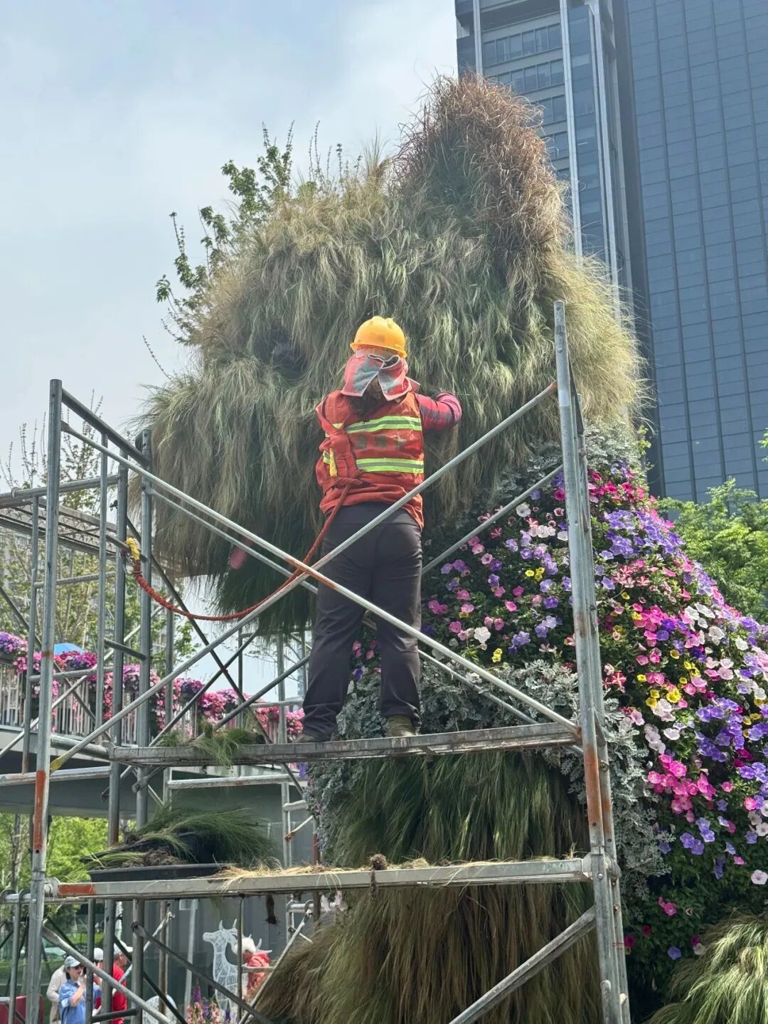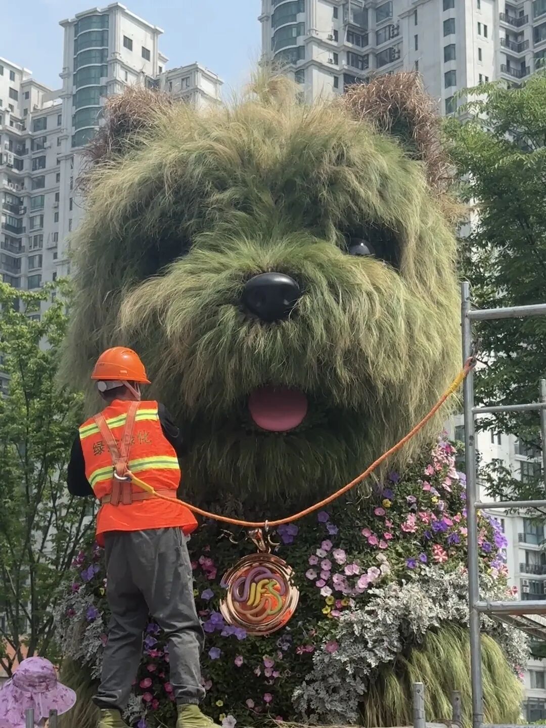 过去这个周末,不少市民发现,静安新晋顶流——巨型“潦草小狗”好像没有刚上岗时那么精神了,连日风吹日晒下来,草色渐渐泛黄,有市民笑称“这像不像五一放假前的你”。4月27日清晨,养护人员架起登高设备,给这只5.2米高的巨型西高地犬绿植雕塑做了一次五一假期来临前的“洗剪吹”美容。
