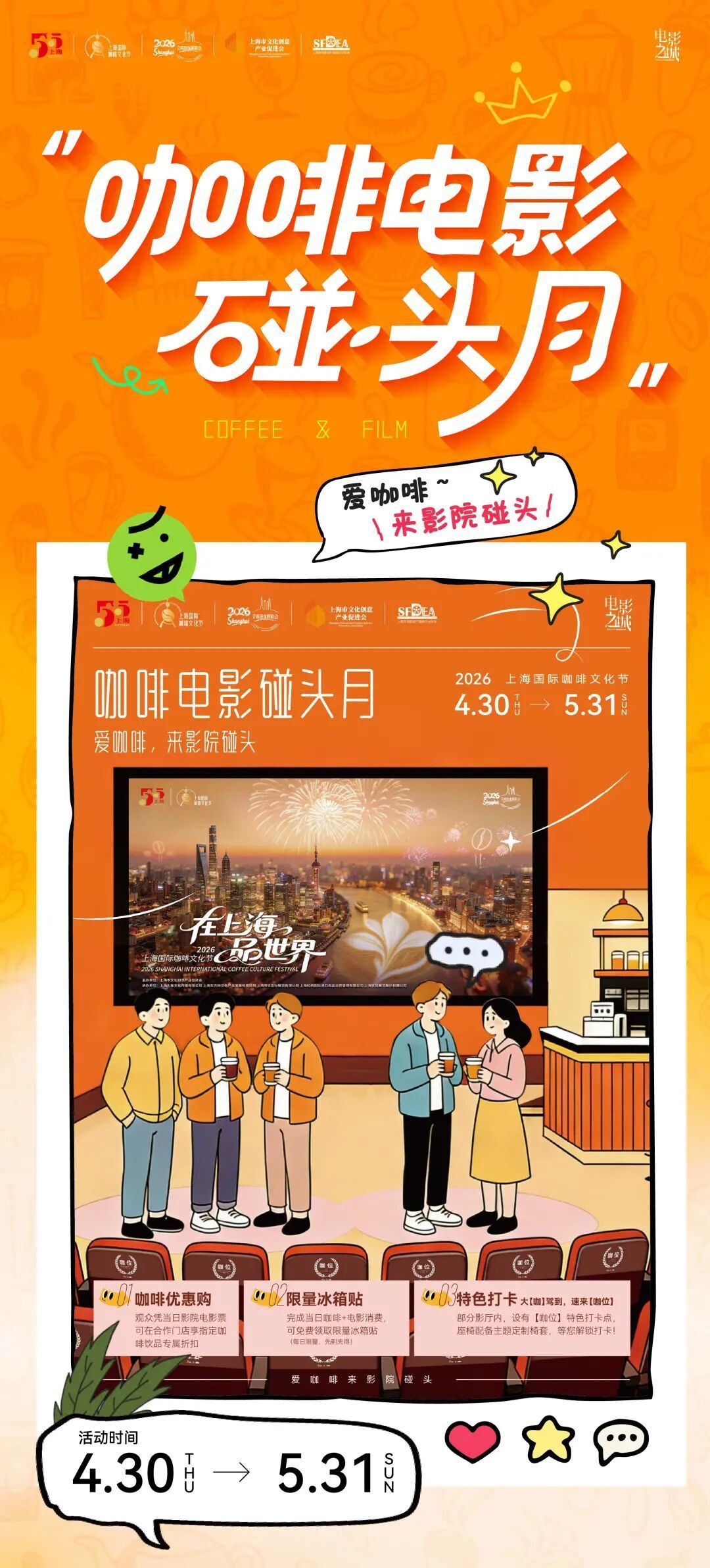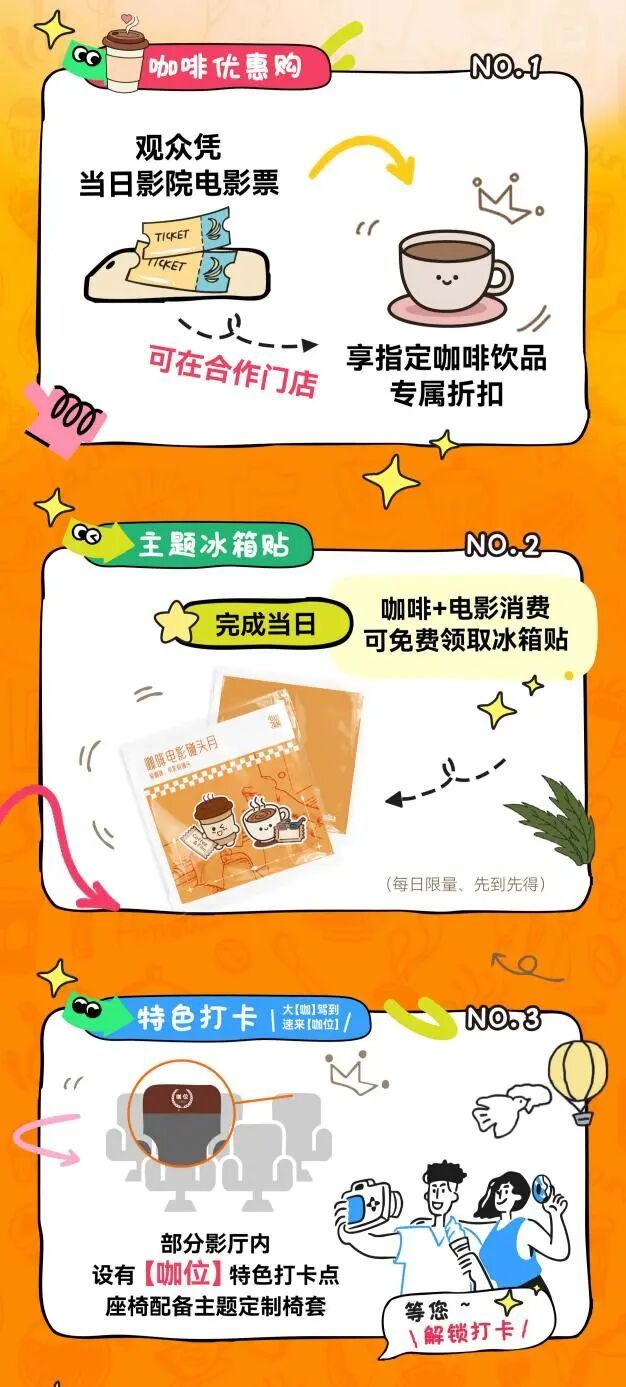 当日完成观影+咖啡双消费并现场打卡合影,即可免费领取活动限定主题冰箱贴1枚(每日限量,先到先得)。