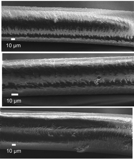 经过漂白的头发(上)以及漂白后经过常规护发素(中)与木质素护发素(下)处理的头发