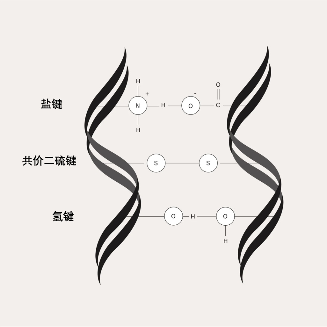 从毛发生物学视角看,角蛋白不仅是一条条由肽键连接的多肽长链,相邻肽链之间还存在横向的二硫键、盐键和氢键,其中共价二硫键是最主要且永久性的角蛋白链“桥梁”。日常清洗、梳理等活动会改变盐键和氢键,但无法影响二硫键;而烫发、漂白等剧烈化学反应则能打断二硫键,严重损伤发质。