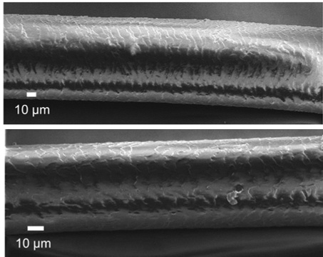 经过漂白的头发(上)和漂白后经过常规护发素处理的头发(下)