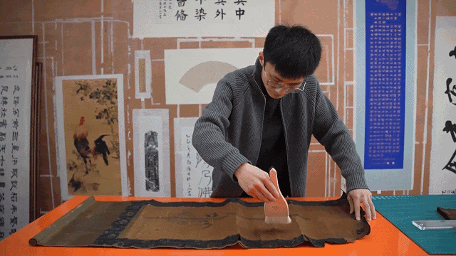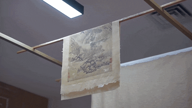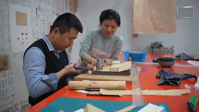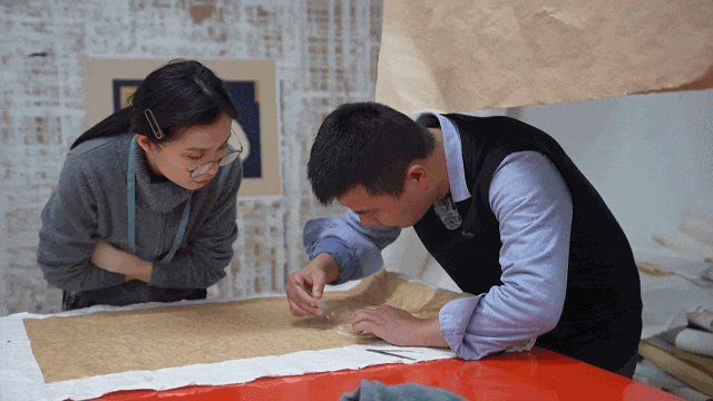 “它这个是木浆纸,我们叫道林纸,要衬这种皮纸。如果它粉碎了,就要衬绢,这样到时候能拿得起来。”秦威威语速不快,稳稳当当。