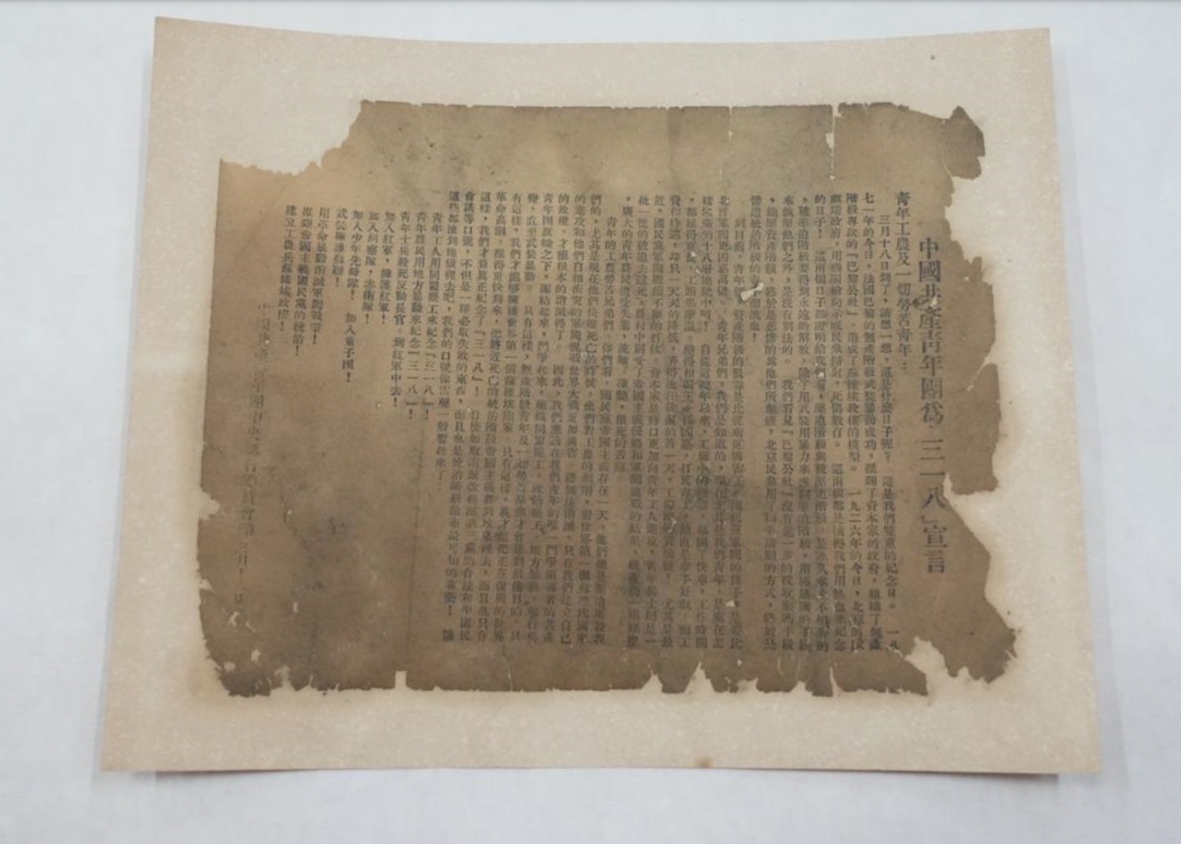 这是2026年工作室承接的首批重要任务之一——来自中共一大纪念馆的革命文物《中国共产主义青年团“三一八”事件宣言》。这份记录着近百年青年热血的历史见证,正被一点点抚平褶皱、去除霉斑。
