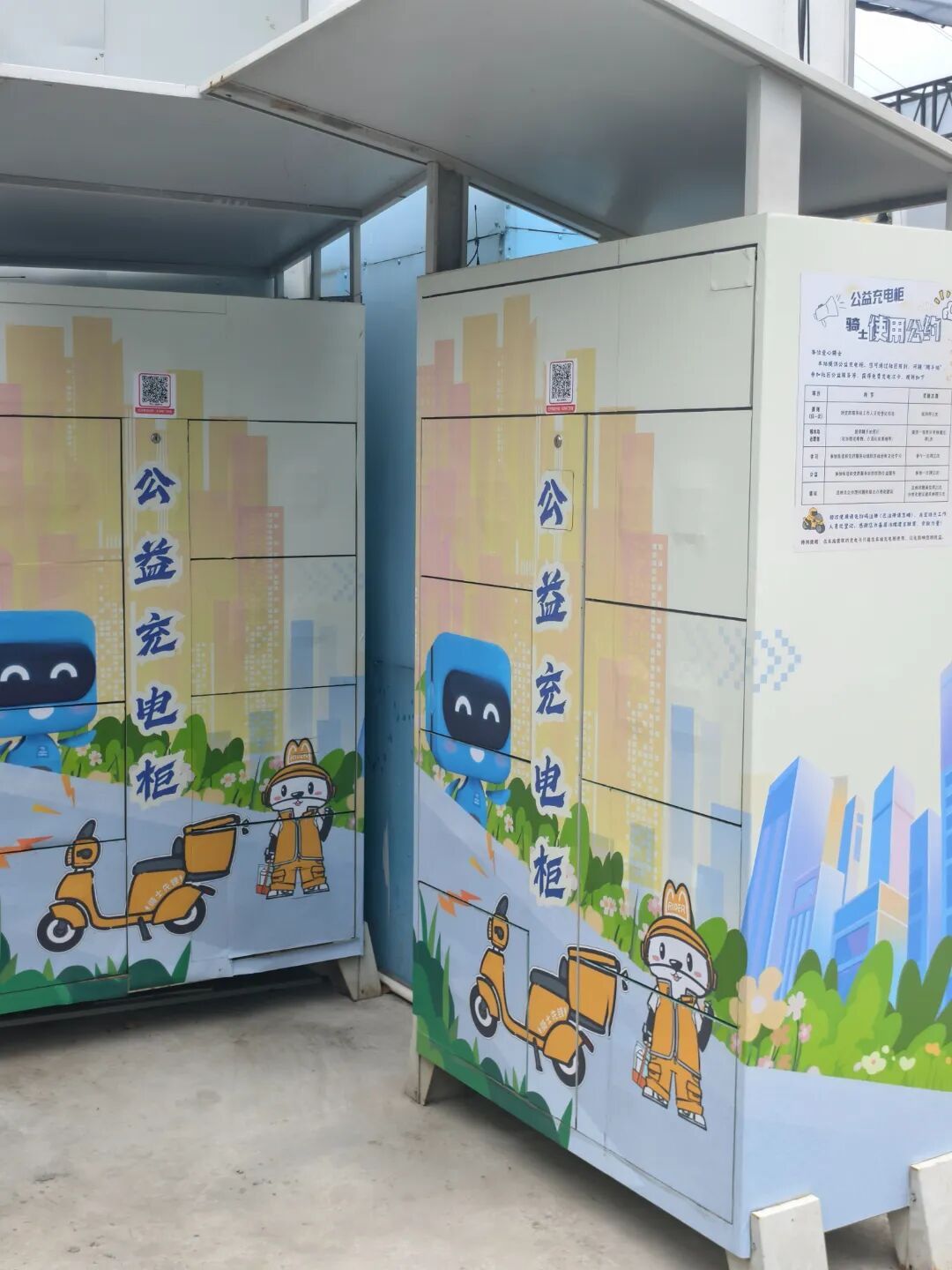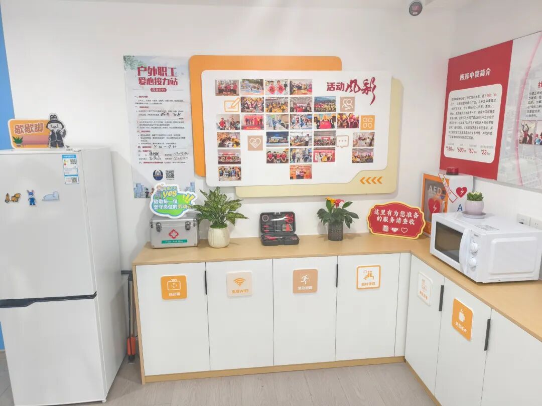 新站点的物理空间实现了扩容提质。主体结构采用集装箱模块,上下两层,总面积较原站点明显增加。一楼为融合型党群服务区,饮水、休憩、充电、便民工具等设施一应俱全;二楼则是工地智慧展厅,集中展示项目进展与施工技术。室外还专门设置了公益骑士充电柜,方便骑手快速更换电池。