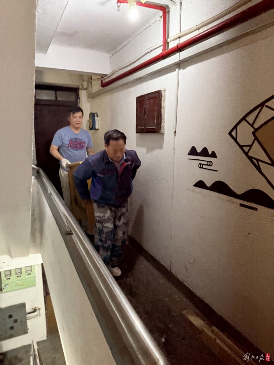 在另一位孤老家,小沈和搬家师傅一起将沉重的家具和大包裹运到车上,又跟随老人一起来到过渡房。在帮老人整理好生活用品后,小沈又敲开老人隔壁邻居的家门,帮老人向邻居们“打个招呼”,并说明老人的情况,请他们帮忙照应一下。临走时,他还将自己和居委会办公室的联系方式留给了小区门卫,请对方关照一下老人,若老人有需要帮忙,请他们联系自己与居委会。